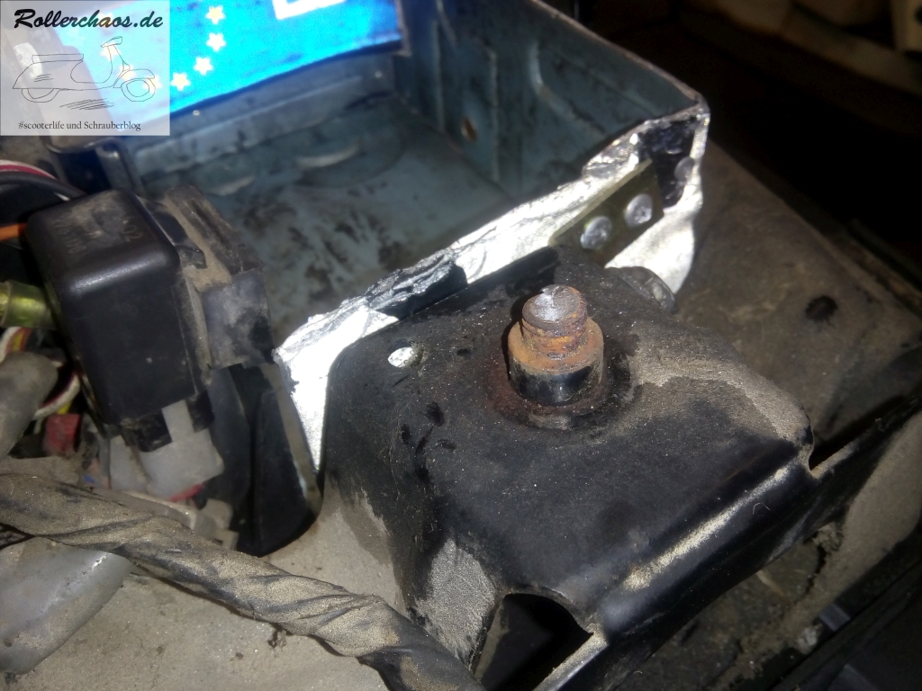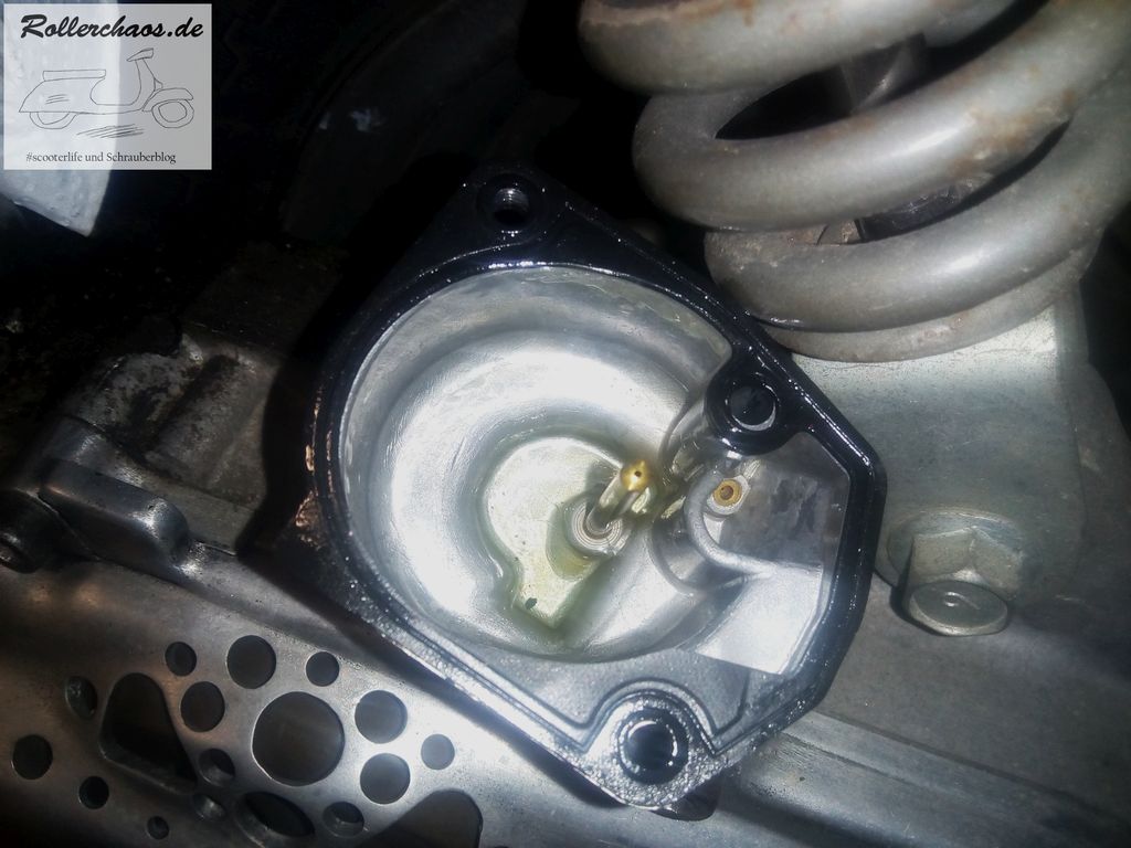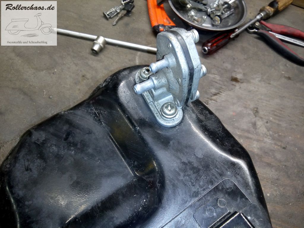 Da der Tank sowieso ausgebaut war, habe ich dann noch den Benzinhahn kontrolliert. Dieser ist völlig in Ordnung, also keine Erklärung für die sporadischen Aussetzer des Rollers bei längerer Vollgasfahrt.