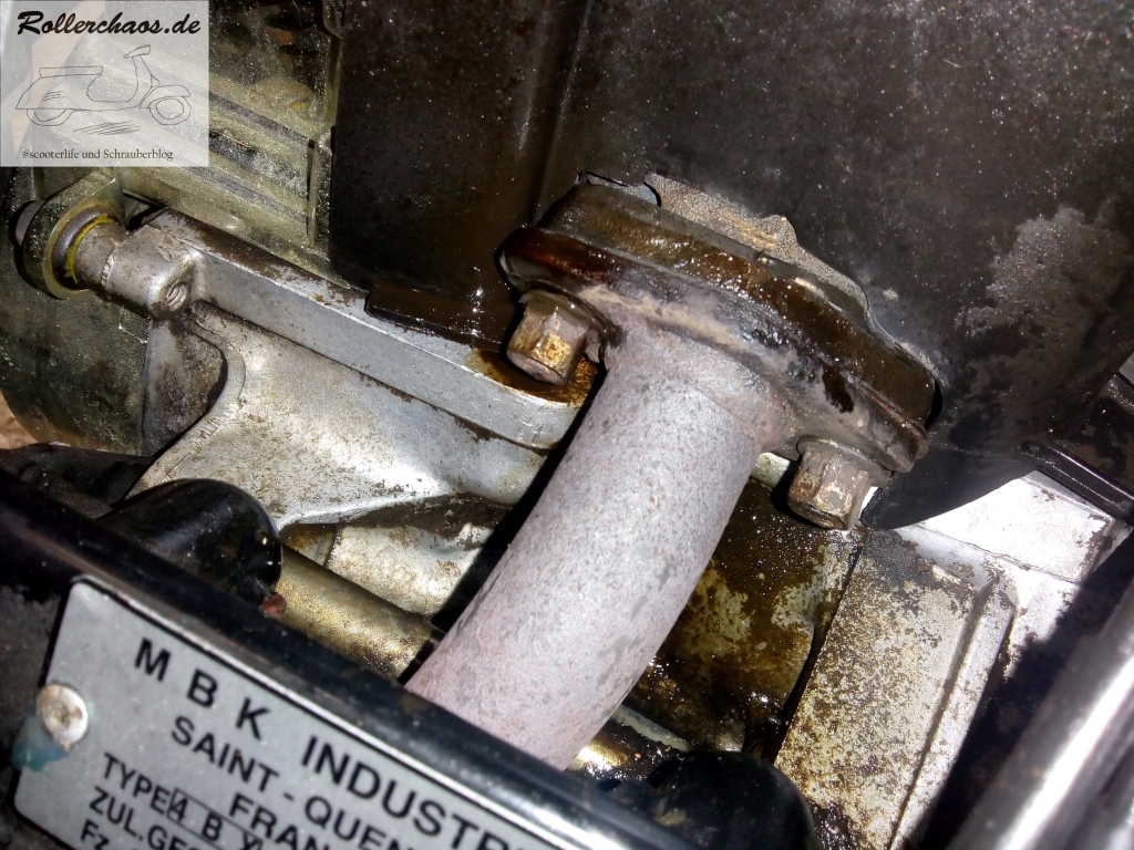 Bei der heutigen Ausfahrt wurde der Roller langsam immer lauter und gleichzeitig immer langsamer. Ein typisches Zeichen für Auspuffprobleme und zunächst dachte ich, dass die Auspuffdichtung endgültig aufgegeben hätte. Es war mir nämlich schon aufgefallen, dass der Roller etwas am Auslass sabbert.