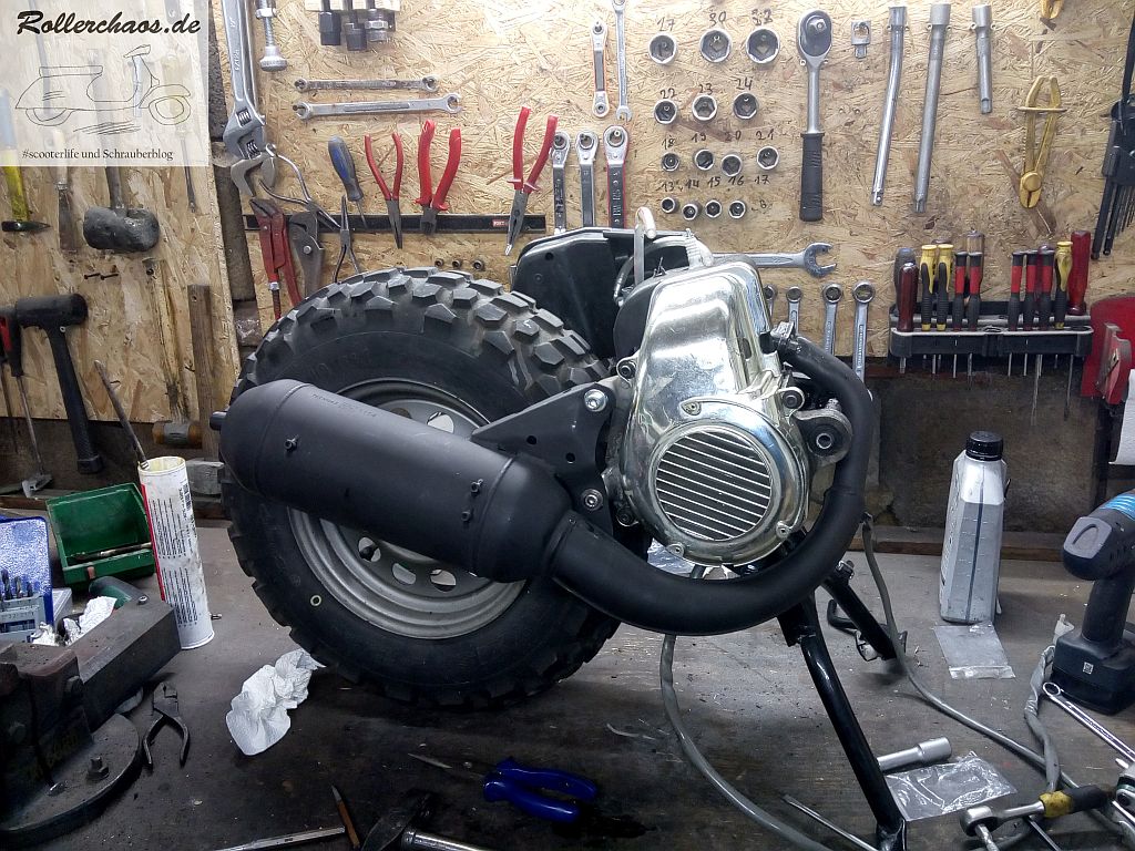 Beim stehenden Minarellimotor ist es allerdings deutlich einfacher, den Auspuff bei ausgebautem Motor anzubringen. Darum kam der neue Auspuff auch noch an den Treibsatz. Die Tage des unseeligen Rennauspuffs sind damit endgültig gezählt, der Technigas dürfte eine deutlich bessere Wahl sein.