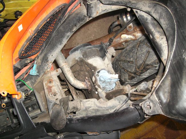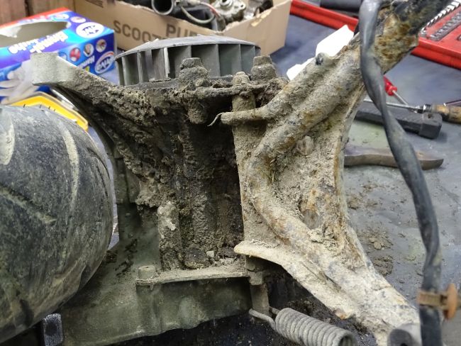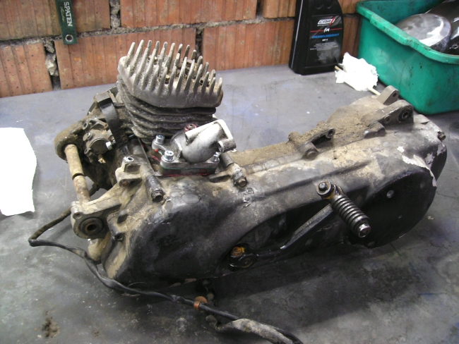 Der Roller steht seit einem Jahr, nachdem er einen Kolbenfresser hatte und deshalb der Zylinder demontiert wurde. Insgesamt ist sein Zustand eher mäßig, aber unfallfrei und was da ist, ist in rettbarem Zustand. Nur total verdreckt ist er halt. Die fehlende Seitenverkleidung und der fehlende Kotflügel lassen sich beschaffen, der Rest ist nur Transplantationsarbeit vom Zenith.
