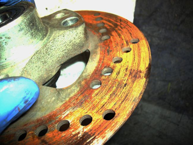 Von der Vorderradbremse kann man dies jedoch nicht behaupten. Die Bremsscheibe ist nicht nur völlig verrostet sondern auch total zerrieft.