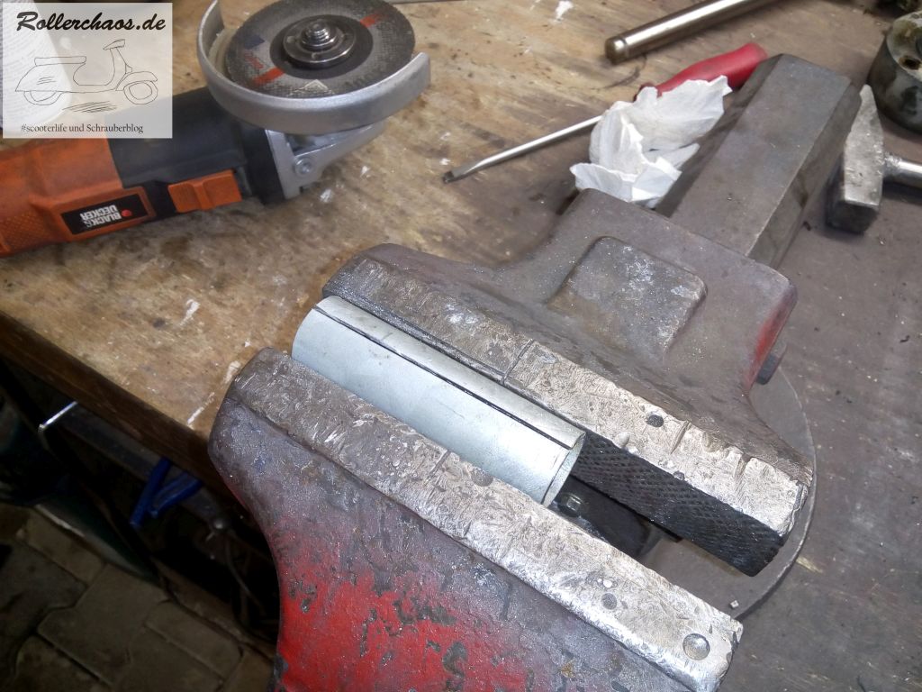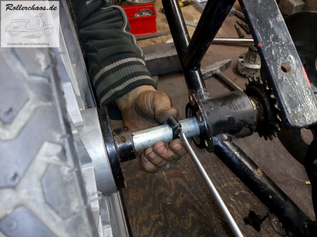 Als simple Lösung gegen Verschieben nach links haben wir ein halbiertes und exakt passendes Rohr auf den rechten Achsstummel gesetzt. Somit ist die Achse in beide Richtungen gegen Verschieben gesichert.