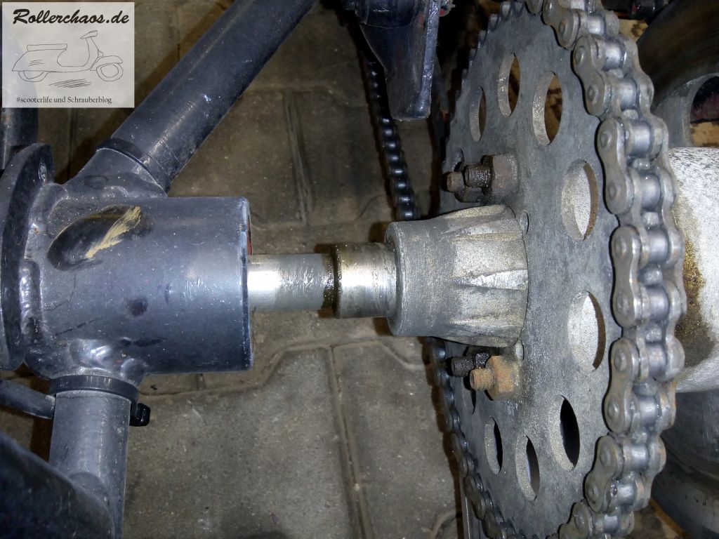 Das Problem mit der Lagerbüchse war vermutlich dadurch entstanden, dass die Achse beim R3 nicht gegen seitliches Verschieben gesichert ist. Die originale Konstruktion vertraut hier scheinbar auf die Bremsscheibe als Wegbegrenzer. Dabei ist interessant, dass sich die Achse nur nach links verschieben kann, denn nach rechts ist das Freilaufritzel der Tretkette im Weg.