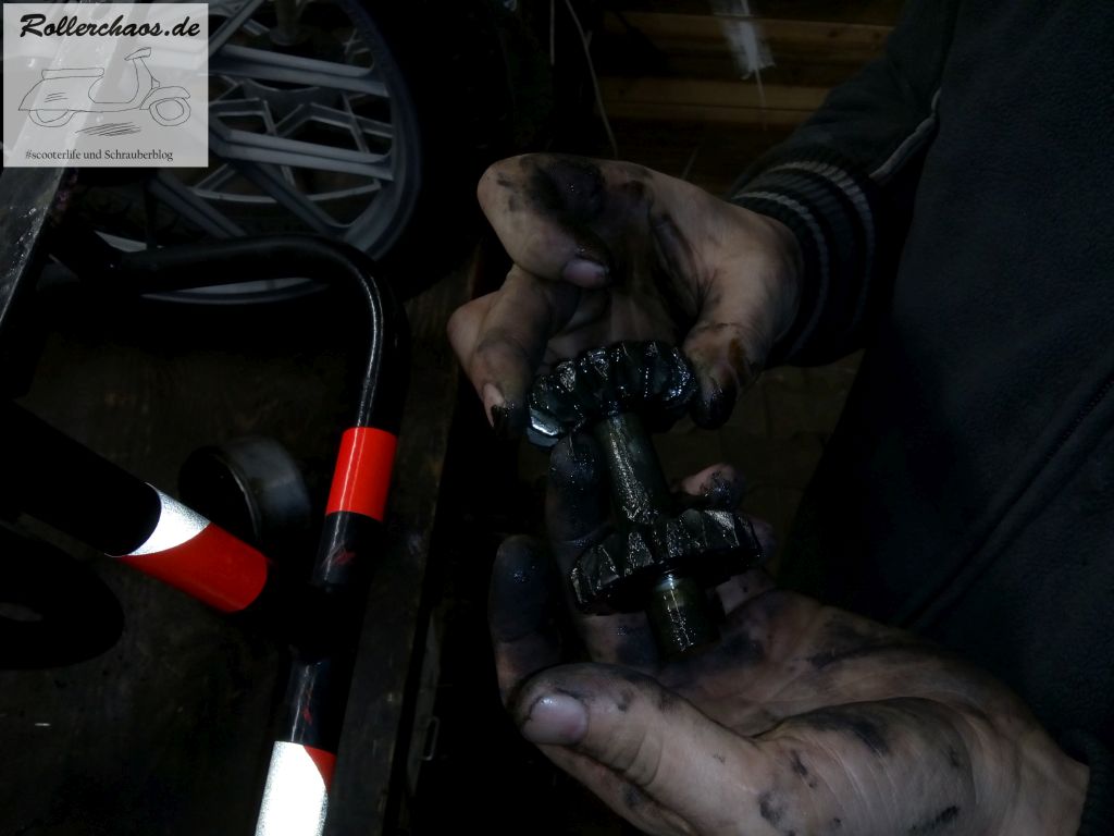So ist auch das Differential schön zugänglich. An der linken Achse sieht man die heraus stehende Buchse. Die komplette Achse hat sich verschoben und damit den Antrieb außer Gefecht gesetzt.