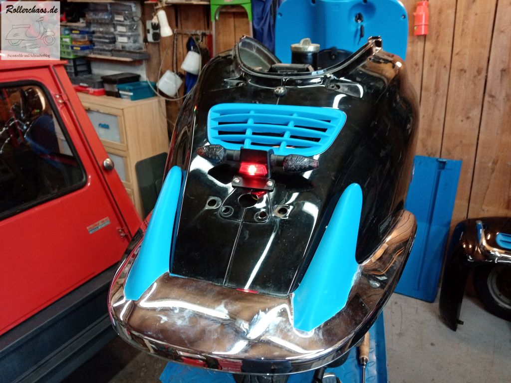 Fertig ist der Roller deshalb aber noch lange nicht. Das Heck kam erstmal nur probeweise wieder dran, denn das originale Rücklicht geht halt einfach gar nicht.