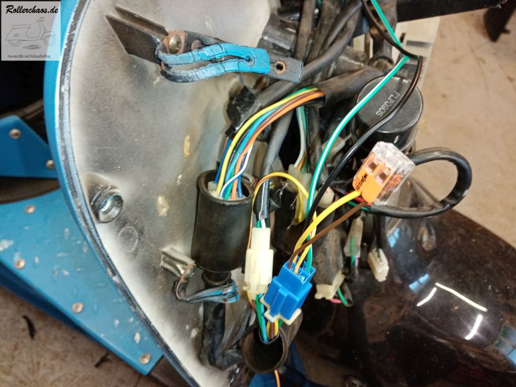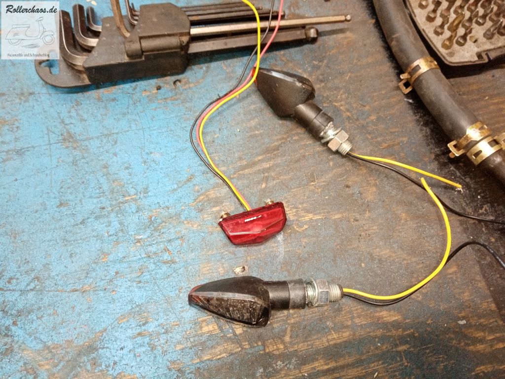 Das Ganze musste dann natürlich noch mit der Elektrik des Rollers verbunden werden, wozu das originale Rücklicht seinen Kabelbaum spenden musste. Aber so sieht es gut aus und funktioniert sogar.