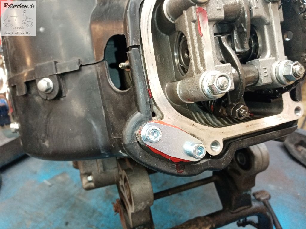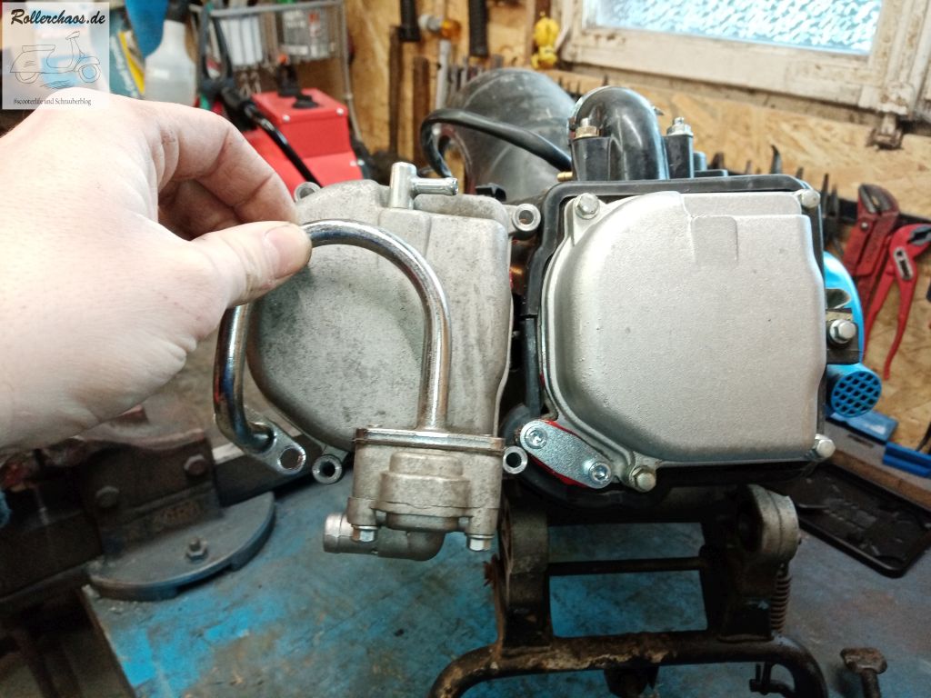 Doch erstmal musste natürlich der Motor zurück in den Roller. Auch hierbei ist der neue Deckel hilfreich, denn er verhakt sich nicht am Rahmenquerrohr. Man merkt deutlich, dass die AGR nicht Teil der ursprünglichen Konstruktion war, sondern nachträglich hinzugefügt wurde.