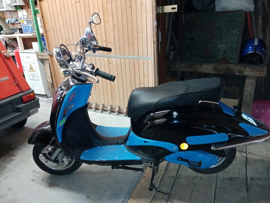 Für eine Lösung die erstmal nichts gekostet hat finde ich das ganz gelungen. Zeit den Roller endgültig zusammen zu schrauben und eine erste Probefahrt auf dem Feldweg hinter der Werkstatt zu unternehmen.