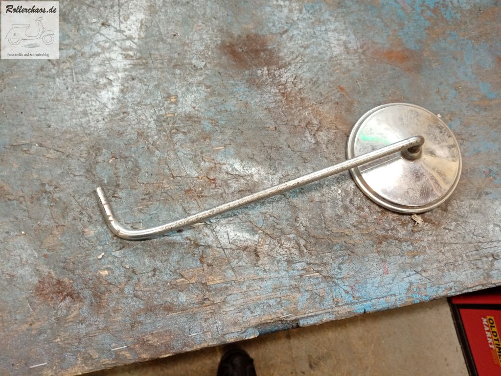 Die Lösung wäre ein langer, dünner Spiegel der sich unter den Lenker setzen lässt. Solche gibt es zu kaufen, aber sie sind teuer, zu teuer für ein Low-Budget-Spaßprojekt wie das Chopperding. Darum gibt es nun eine echte Orklösung in Gestalt eines alten Mofaspiegels aus der Wühlkiste.