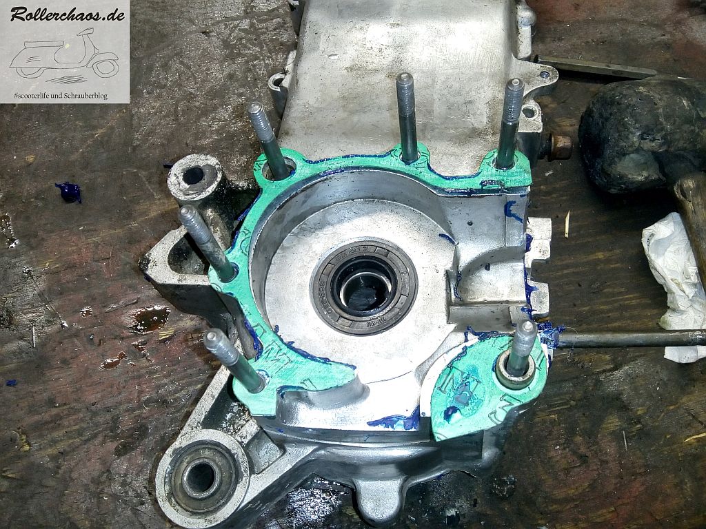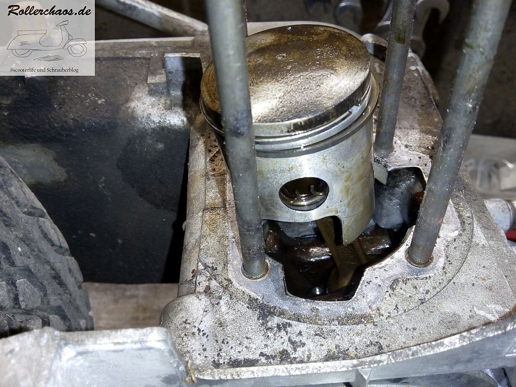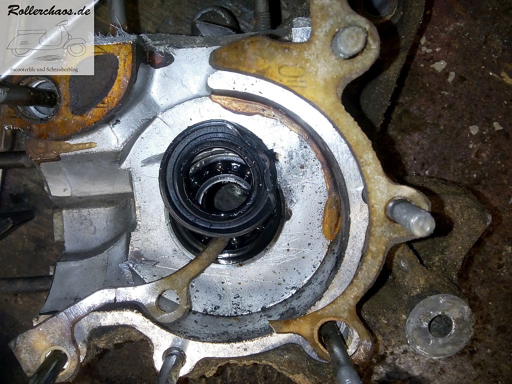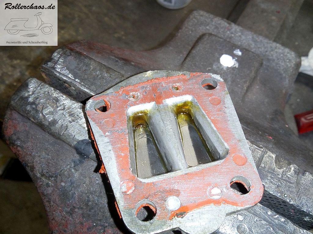Schuld daran ist wohl eine Nachlässigkeit des Vorbesitzers. Der Roller stand scheinbar all die Jahre mit offenem Benzinhahn und der Treibstoff war in die Kurbelkammer gelaufen. Einlassmembranen und Kurbelgehäuse sind entsprechend voll klebrigen Rückständen.