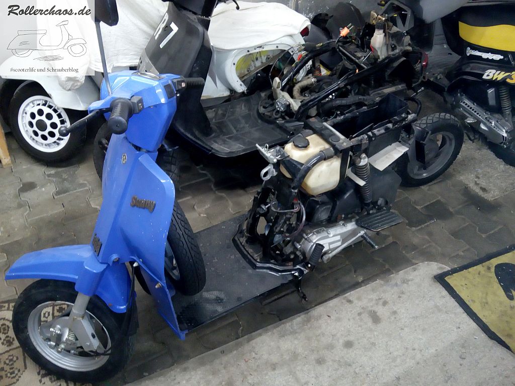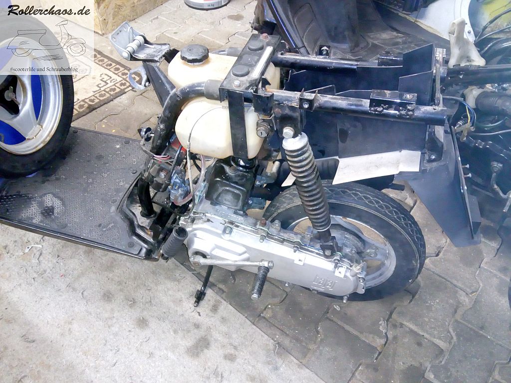 Mit einem modernen Automatikroller-Motor hat das Teil nahezu nichts gemeinsam. Die Antriebskonstruktion ähnelt eher einem Eingang-Automatikmofa ala Puch Maxi. Aber davon wird es noch mehr Detailbilder geben. Youtube-Videos sind außerdem in der Mache 😉
