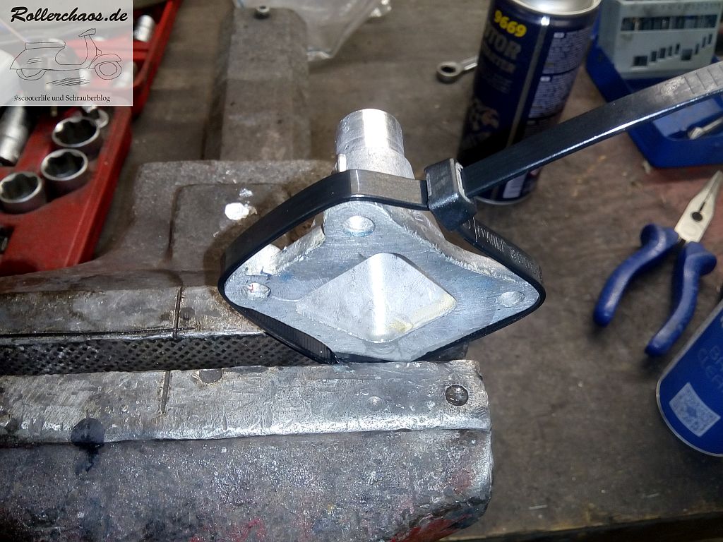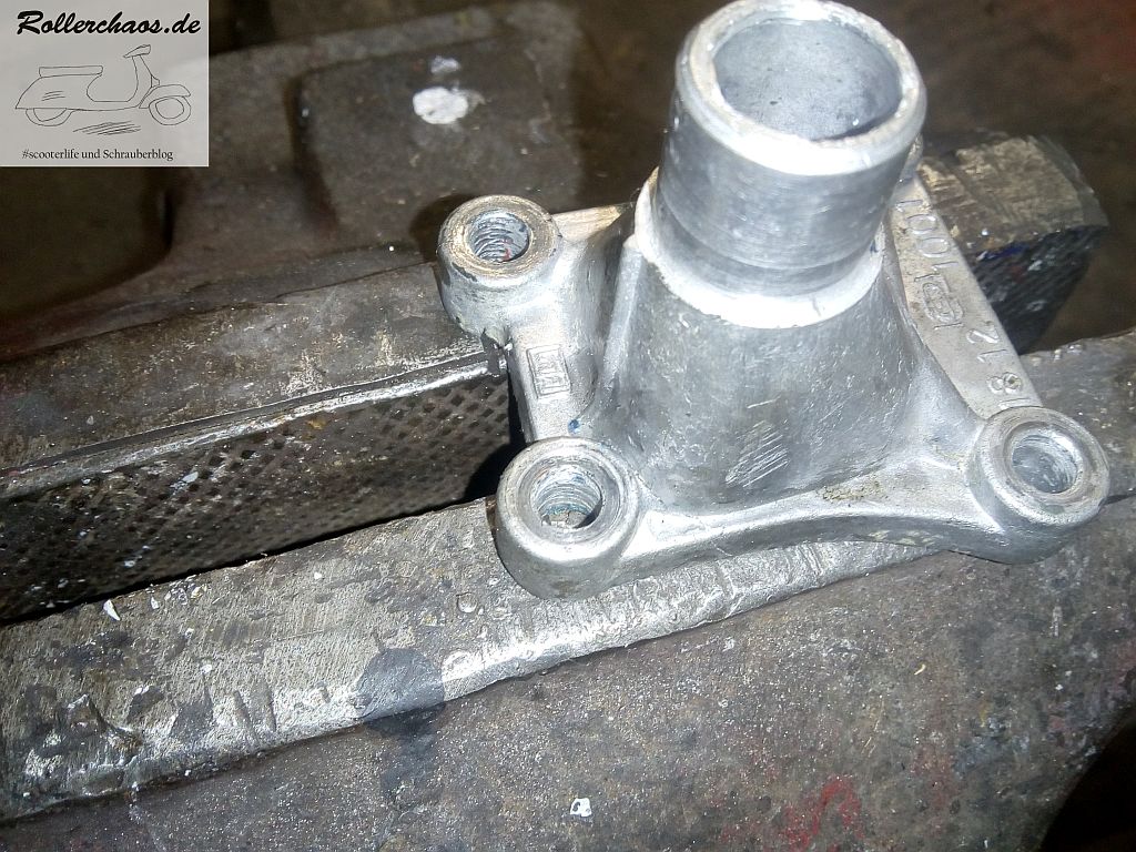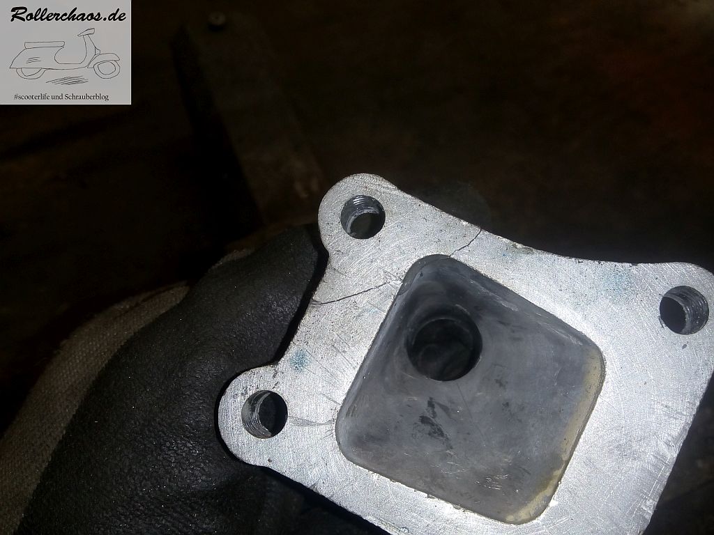 Die Problemursache ist leider ein kleiner GAU. Der Ansaugstutzen ist an einer Anschraublasche gebrochen. Natürlich ist der Ansaugstutzen eines der Teile die nirgendwo, nicht einmal in Indien, zu bekommen sind. Warum das passiert ist? Nun, zu 99,9% war es mein Fehler, nämlich eine überspannte Schraubverbindung. Was kann man da machen? Einmal laut das Sch-Wort schreien und hoffen, dass sich möglichst bald ein Ersatzteil finden lässt.