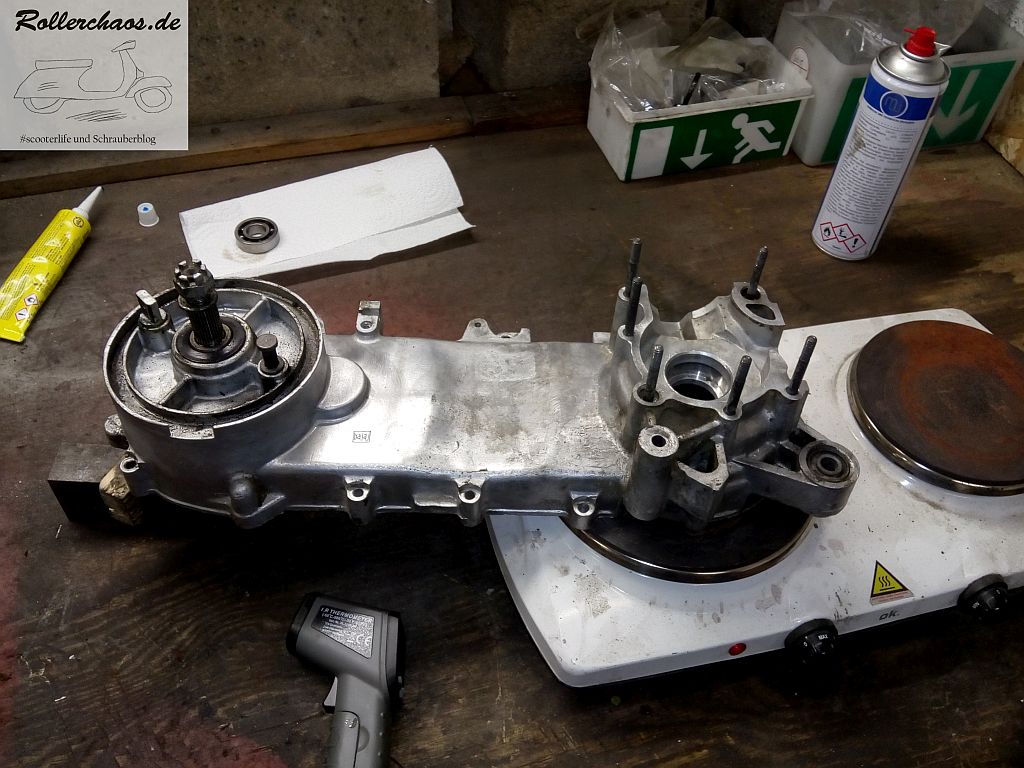 Es war ja nur ein Kurbelwellenlager ausgebaut, darum ging es relativ flott. Die übliche Methode mit Ofenplatte und Eisspray funktioniert auch bei indischer Primitivtechnik sehr gut.