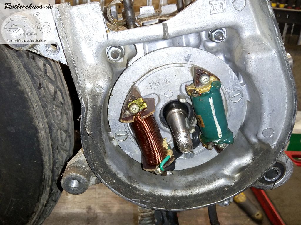 Ebenso unter dem Polrad. Die Zündung ist ebenso sauber wie simpel. Zwei Spulen genügen hier für Licht- und Zündstrom.