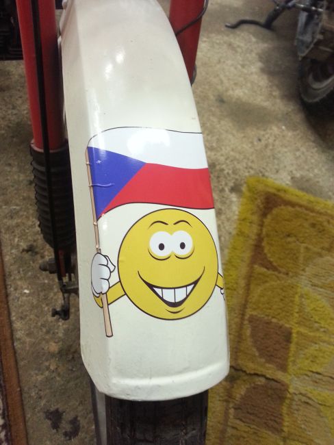 Zum Abschluss der heutigen Schraubersession habe ich der Jawa dann noch den Aufkleber verpasst, den mir ein Oldtimerkollege geschenkt hat als er von diesem Projekt erfahren hat.