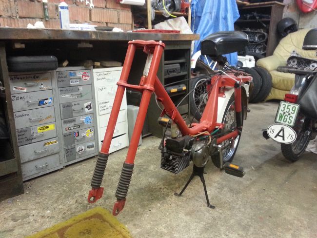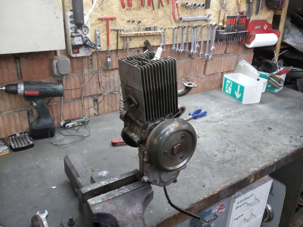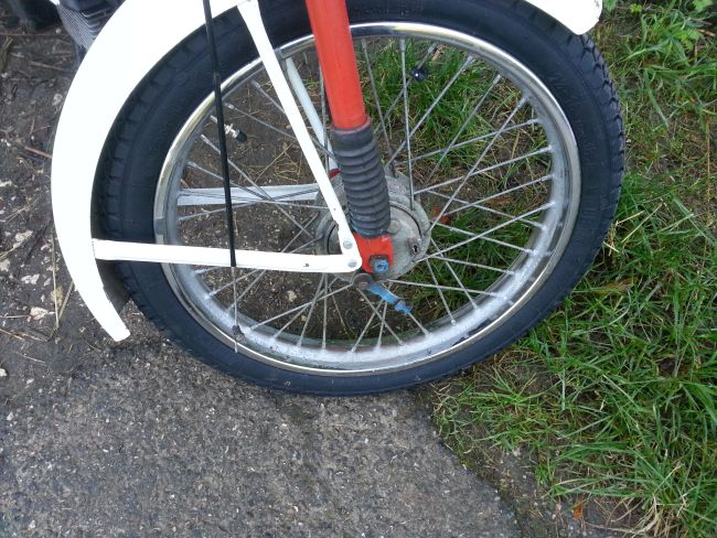 Die Reparatur der Maschine ist ja schon angeleiert, Thum hat mir die Telefonnummer seines Ungarnkontakts zukommen lassen, aber die brauche ich wohl vorläufig doch nicht. Es scheint, als würde mein deutsches Oldtimernetzwerk ein vollständiges 207-Vorderrad inkl. intakter Bremse hergeben. Sehr gut ist vor allem der Preis: Tausch gegen ein Zipgetriebe.