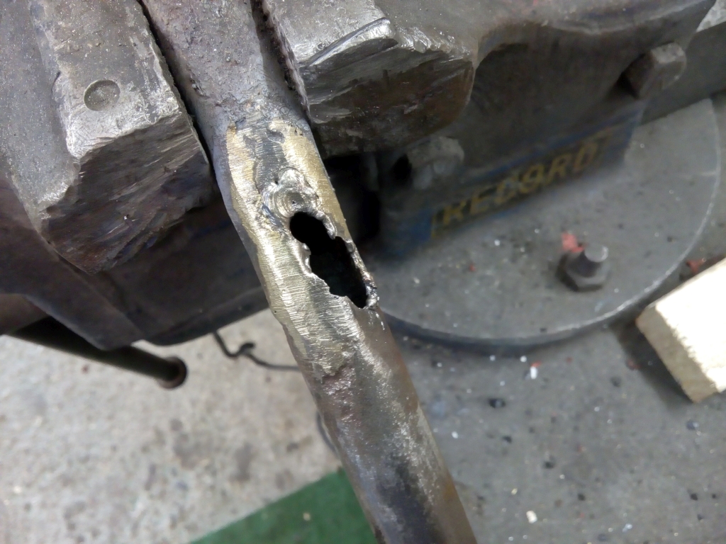 Das "Nadelloch" zu schweißen ist leider nicht möglich, denn das umliegende Material ist hauchdünn rausgerostet.Beim Schweißversuch verdampfte es einfach.