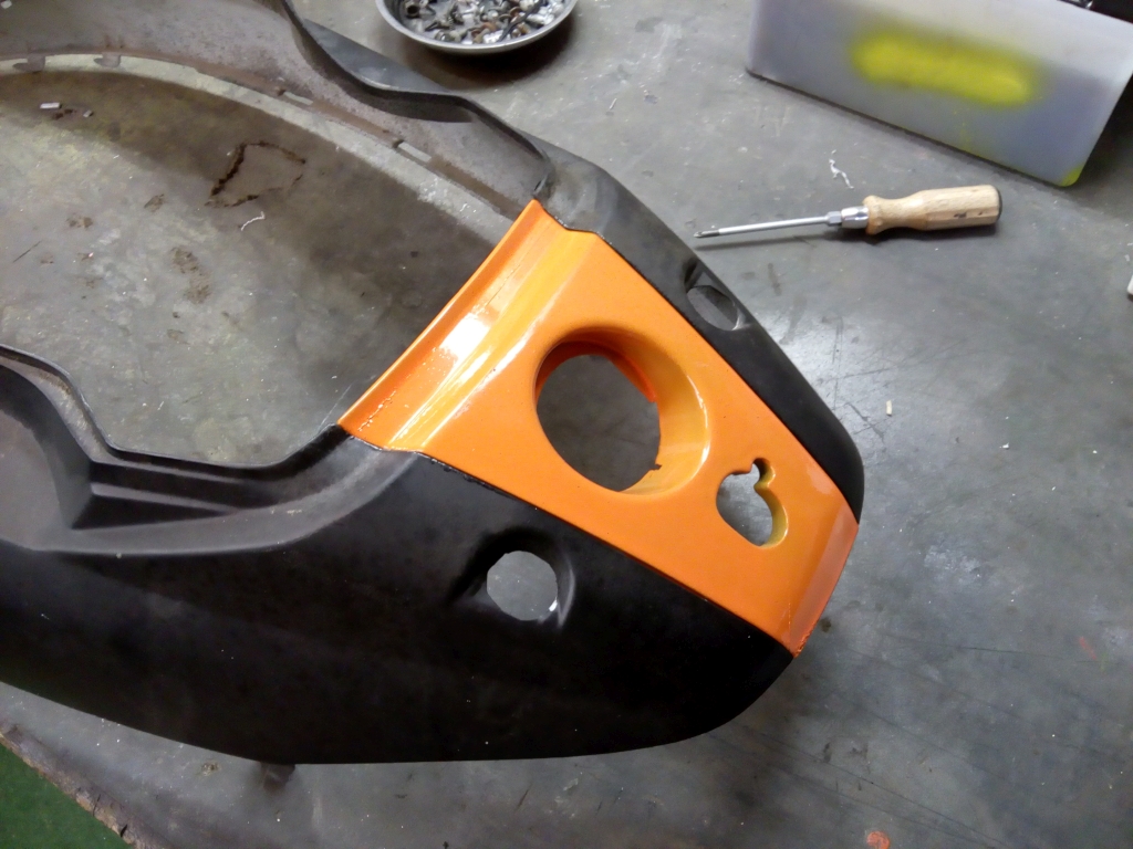 Glänzend Orange ist ein schöner Kontrast zum Naturmattschwarz der Verkleidung.