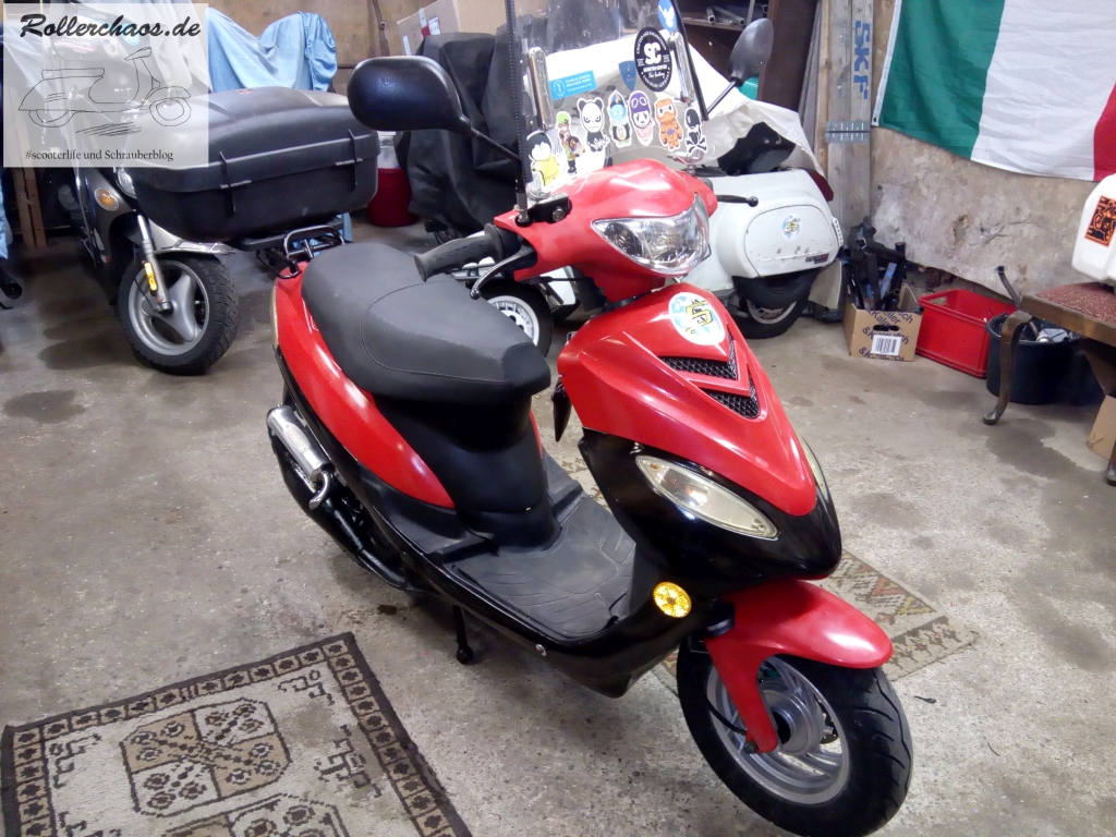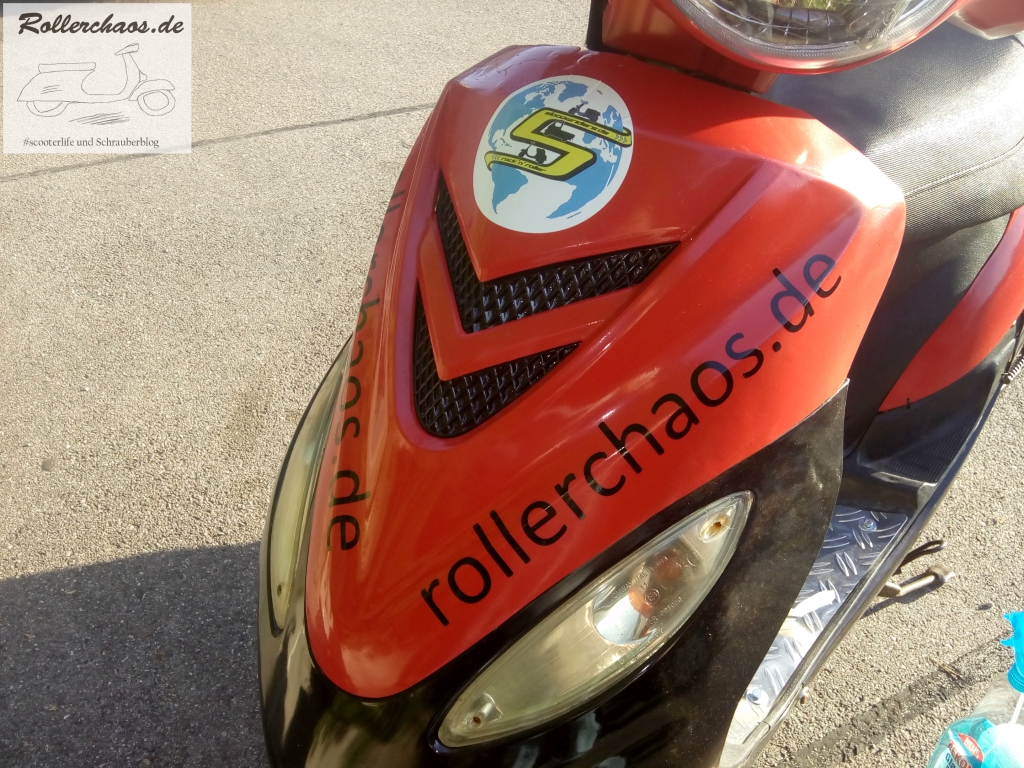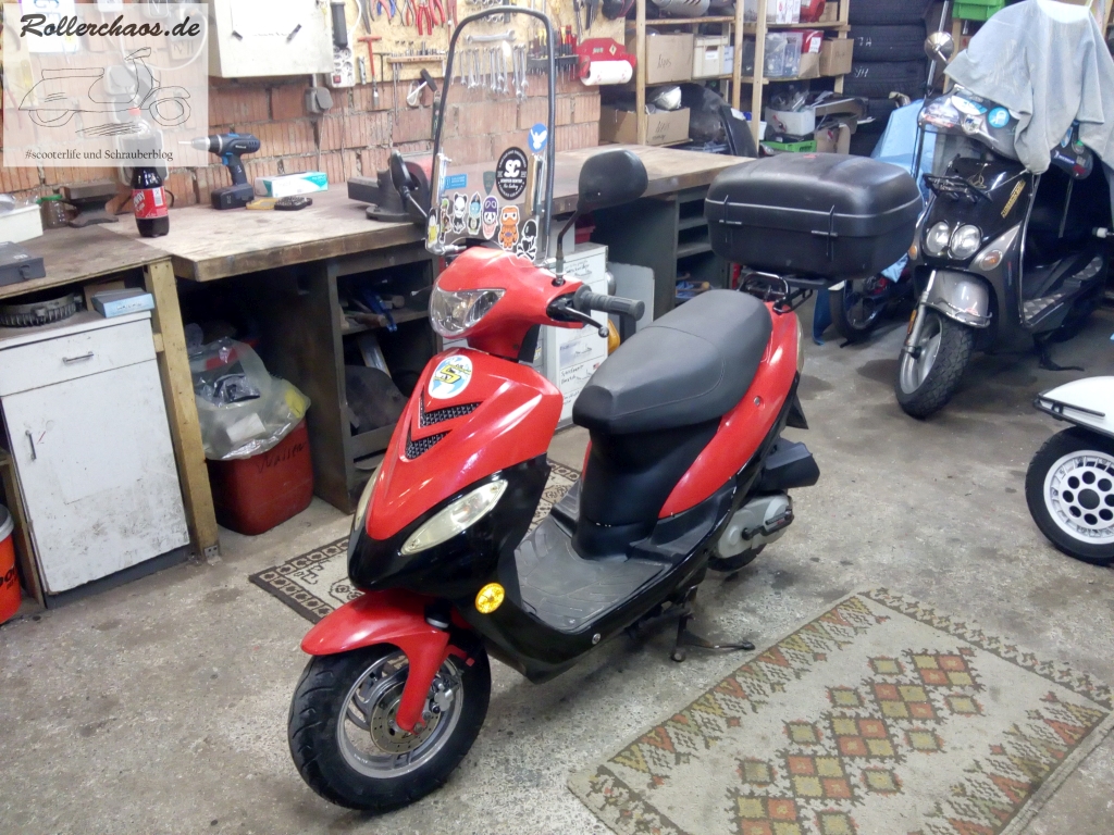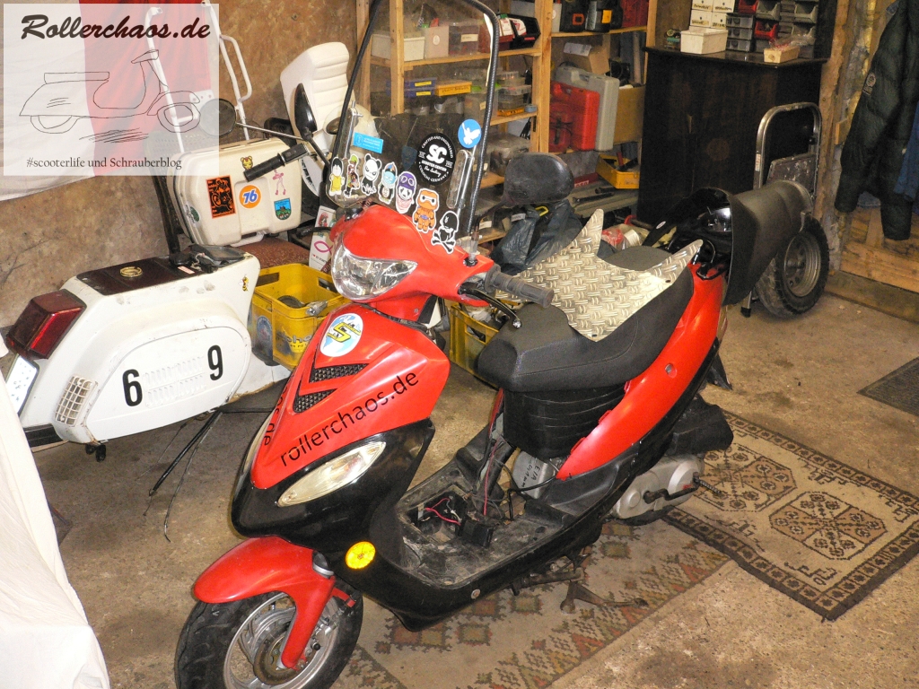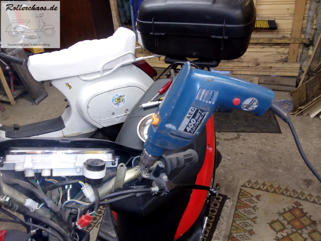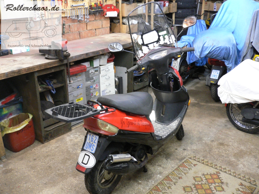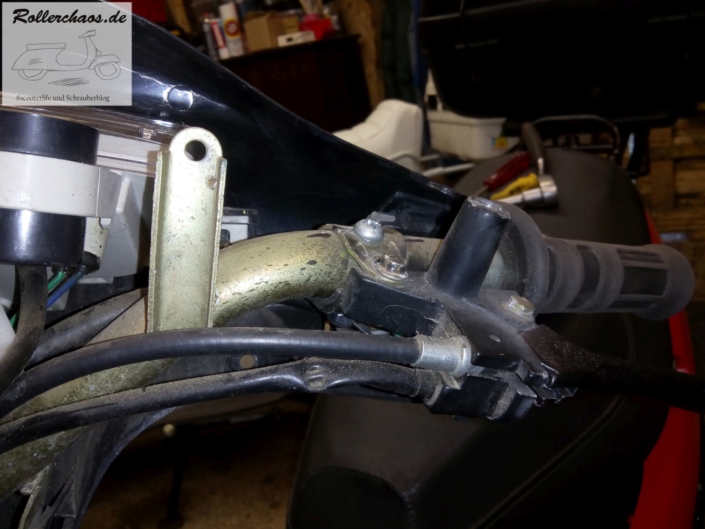 Am Samstag, während Thums Besuch in der Rollerhölle, fiel der vor das Tor verbannte Chinakracher einfach um, ansich nicht weiter schlimm, dumm nur, dass hinterher nicht nur die halbe Verkleidung aus dem Leim war (was bei dem Rotzeimern ja normal ist) sondern die linke Bremsarmatur völlig locker herumbaumelte.