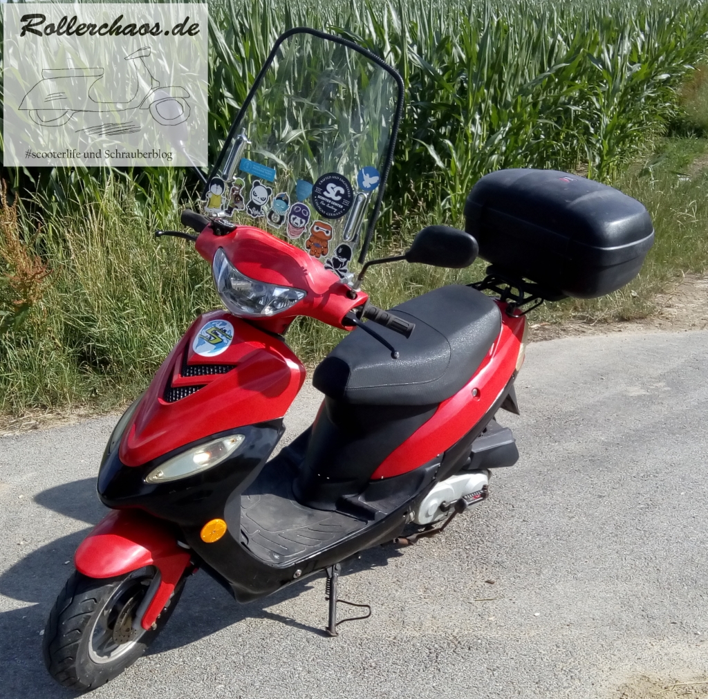Der Lohn der Mühen ist ein Chinakracher der deutlich schräger und sicherer auf dem Seitenständer geht, genau was ich haben wollte. Jetzt kann ein Andenkondor auf der Sitzbank starten ohne das es den Roller umhaut. Zeit den Windschild wieder anzuschrauben und eine Probefahrt zu unternehmen!