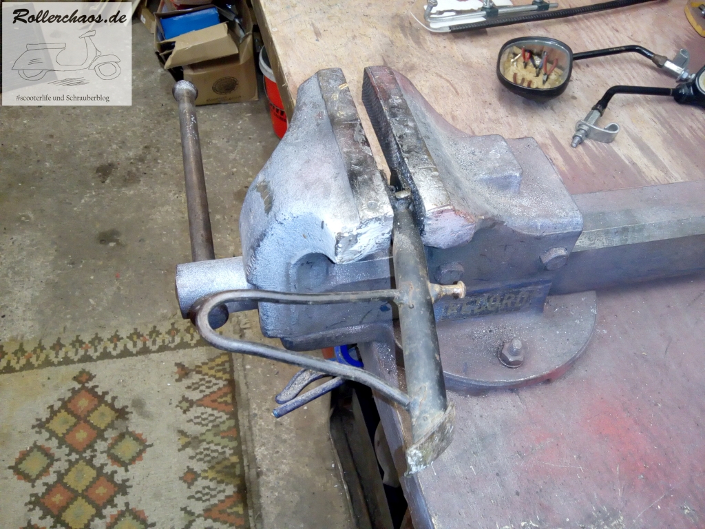 Zunächst muss man den Seitenständer abschrauben und in den Schraubstock spannen. Zwei, drei herzhafte Hammerschläge sorgen dann für einen etwas besseren Winkel.