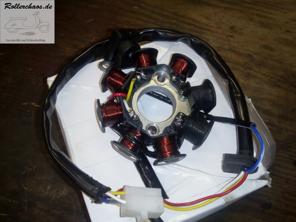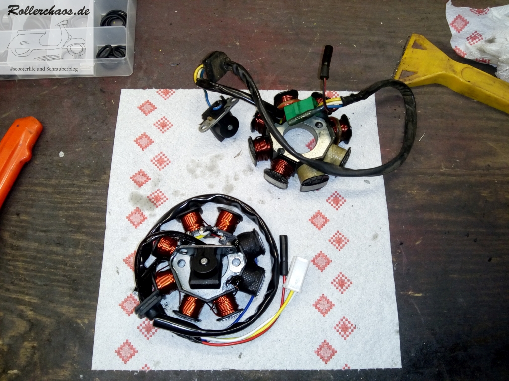 Mit einer davon habe ich den Roller soweit bekommen, dass Spannung (~3V Gleichstrom) an der Zündspule ankommt. Funken? Fehlanzeige. Eine weitere Spule aus dem Fundus zum Test brauchte auch keine Besserung.