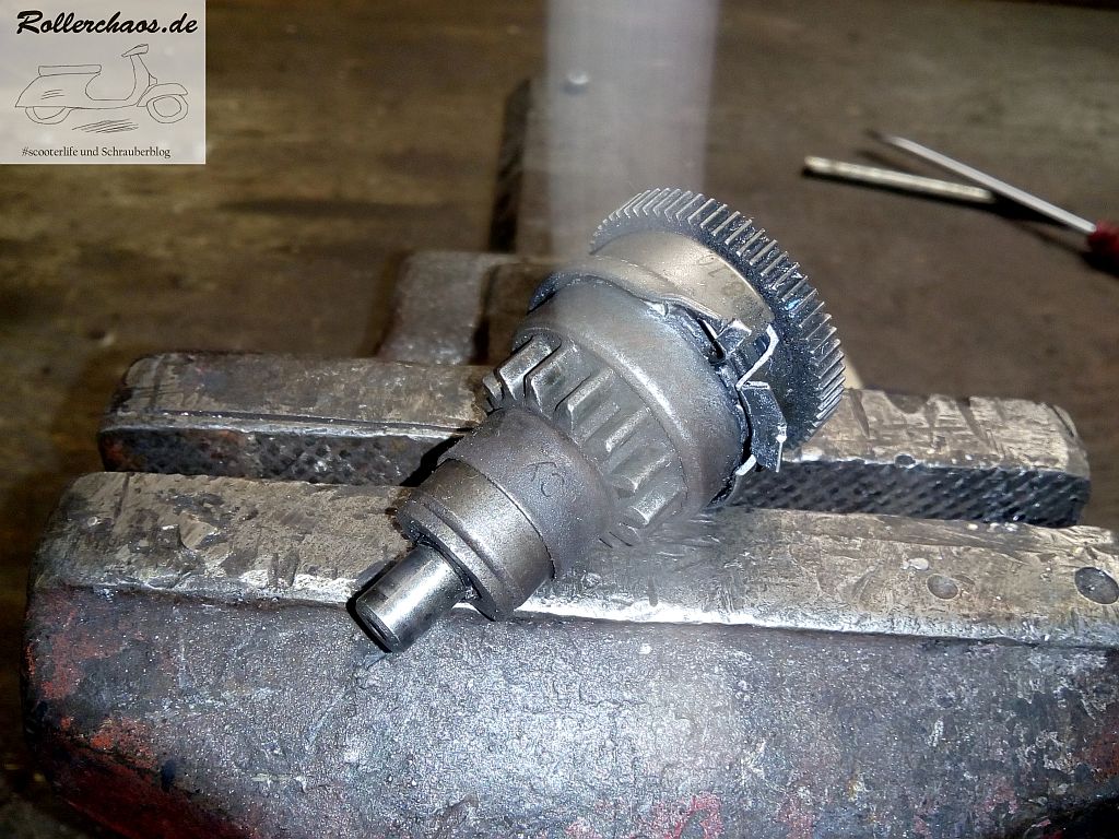 Ursache für das Krachen war ein gesprengter Anlasserfreilauf. Ein ziemlich hässlicher Schaden, den ich so auch noch nicht gesehen hatte. Aber auch das ist bei diesem Fahrzeug ja nichts neues.