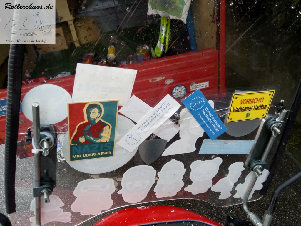 Die Touraufkleber, hier der mit dem Freiberger Stadtwappen, werden halt vor Ort gekauft. Touriinfo, Souvenierläden usw. haben sowas i.d.R. Das sind auch die Aufkleber,die ich eigentlich haben will. So ein Windschild ist nicht nur gut um den Fahrer warm und trocken zu halten, sondern auch als Andenkenwand für Tourenaufkleber.