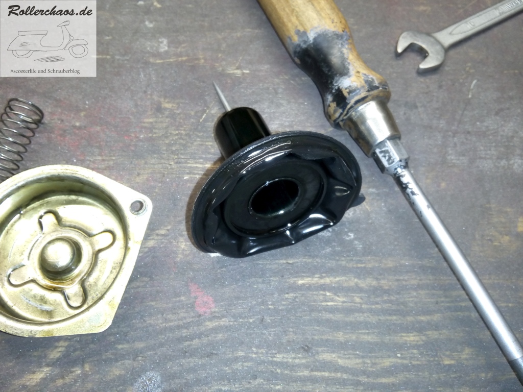 Dafür sieht es im Vergaser recht ordentlich aus, die Membrane ist aber freilich schon wieder hinüber und die Schwimmernadel sieht ebenfalls nicht besonders gut aus.
