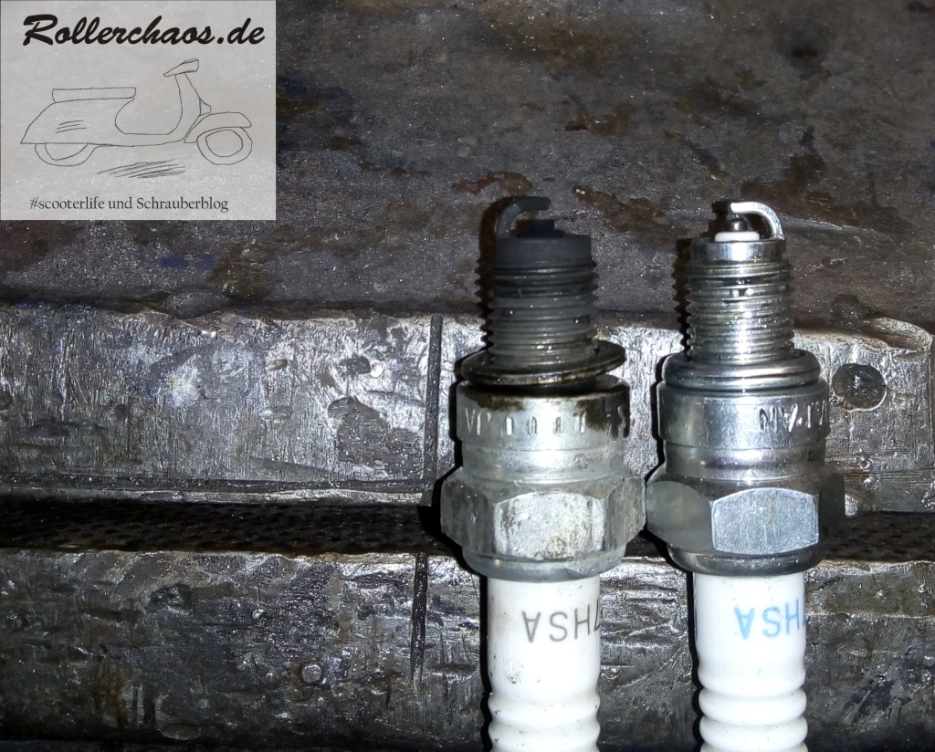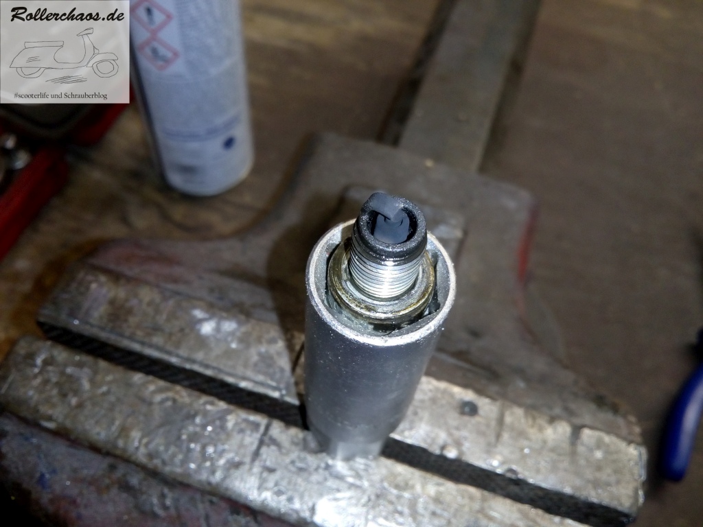 Die völlig verkohlte und verbrannte Zündkerze spricht nicht unbedingt für optimale Verbrennung. Tatsächlich zeigte sich auch, dass die Leerlaufkorrektur am Vergaser völlig verstellt war. Mit einigen Korrekturen lief der Roller dann, mit kaltem Motor, brauchbar im Stand. Sobald der Motor aber auf Betriebstemperatur ist geht das Spielchen wieder von vorne los. Es ist unmöglich einen brauchbaren Leerlauf einzustellen.