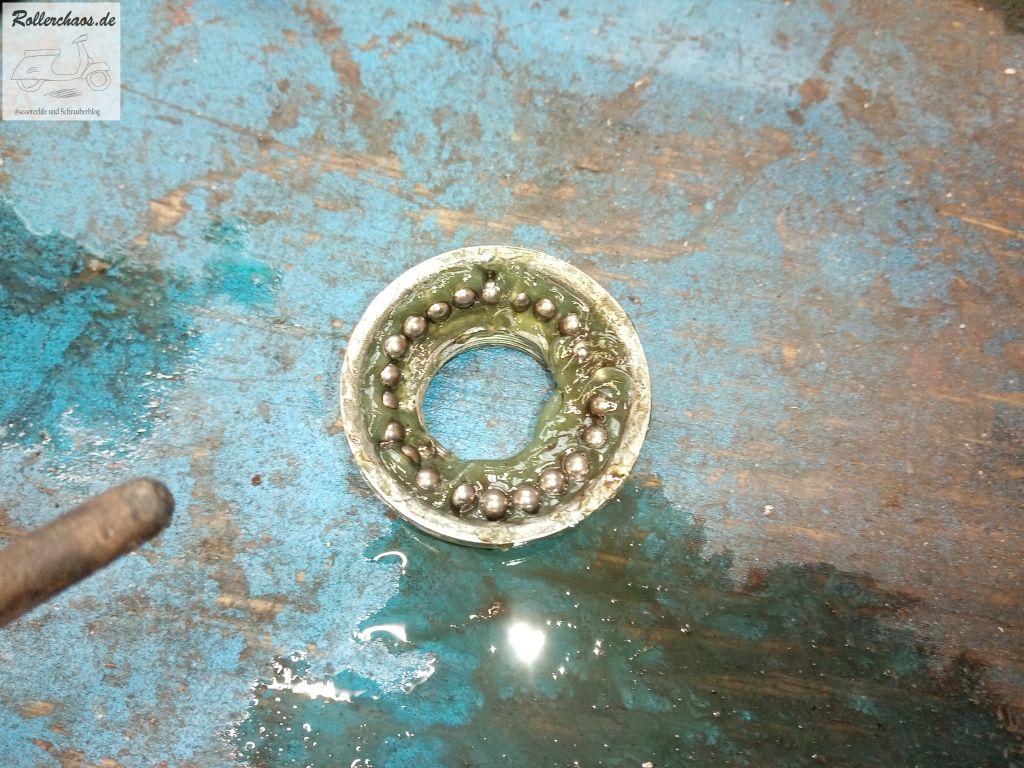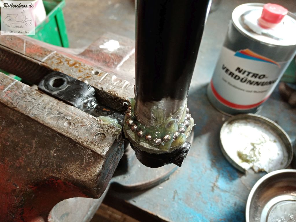 Wenn man das dann schon soweit auseinander hat, dann bietet es sich an, gleich den kompletten Lenkkopf auszubauen und das Lager zu schmieren. Etwas, das hier in den letzten 30 Jahren ziemlich sicher nicht gemacht wurde.