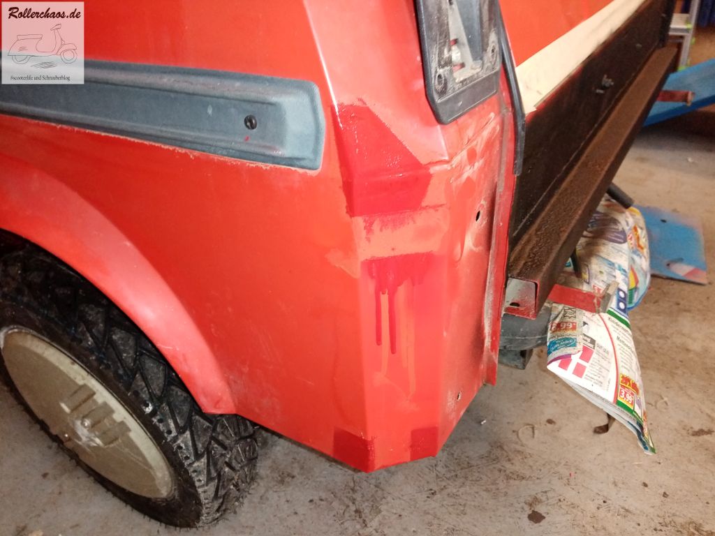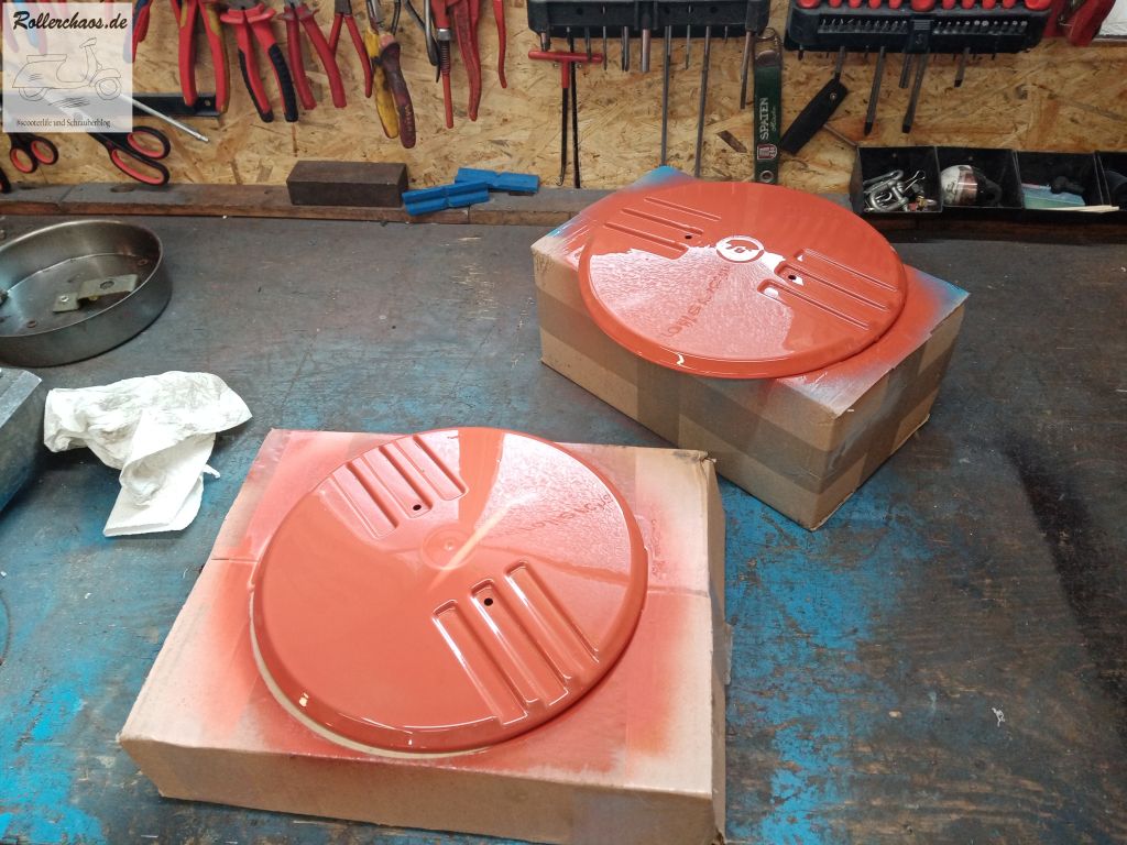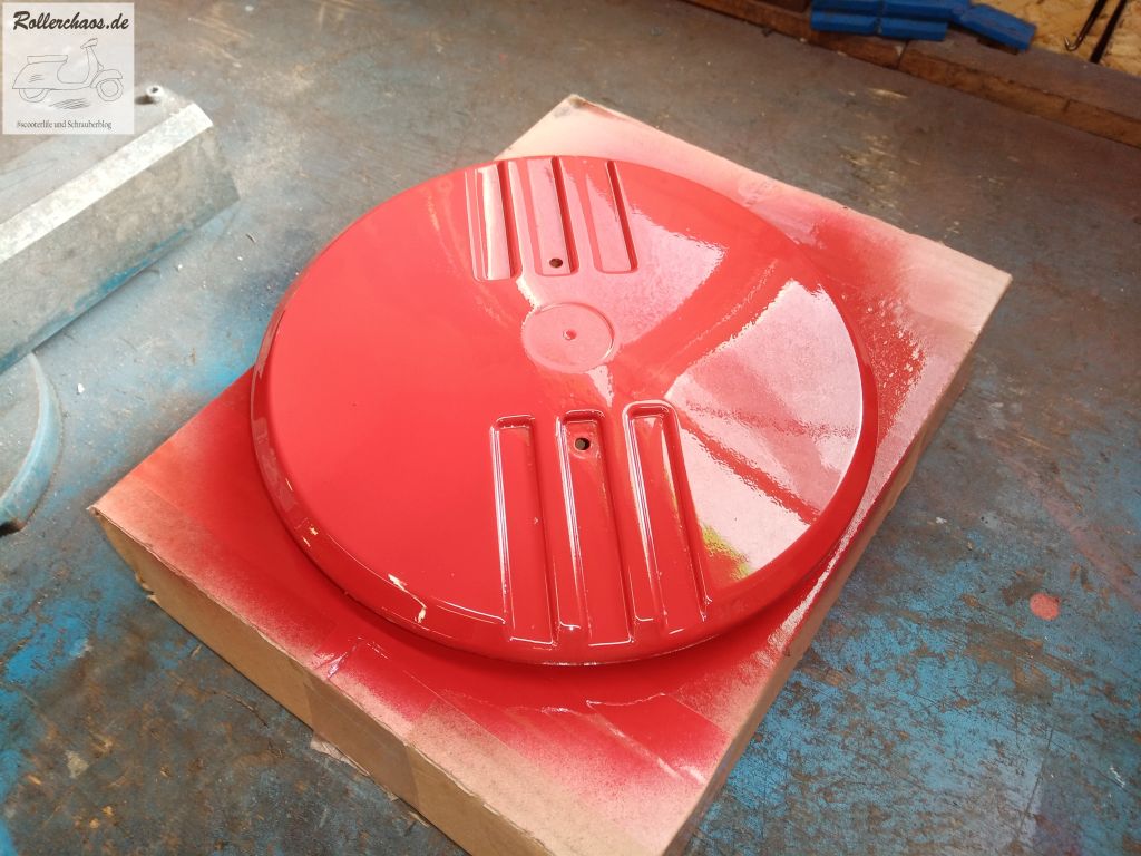 In der Zwischenzeit war dann auch die Grundierung auf den Radkappen getrocknet und der Decklack in passendem Rot konnte drauf. Das sollte dann doch deutlich besser aussehen, als brüchiger Krümelplast.