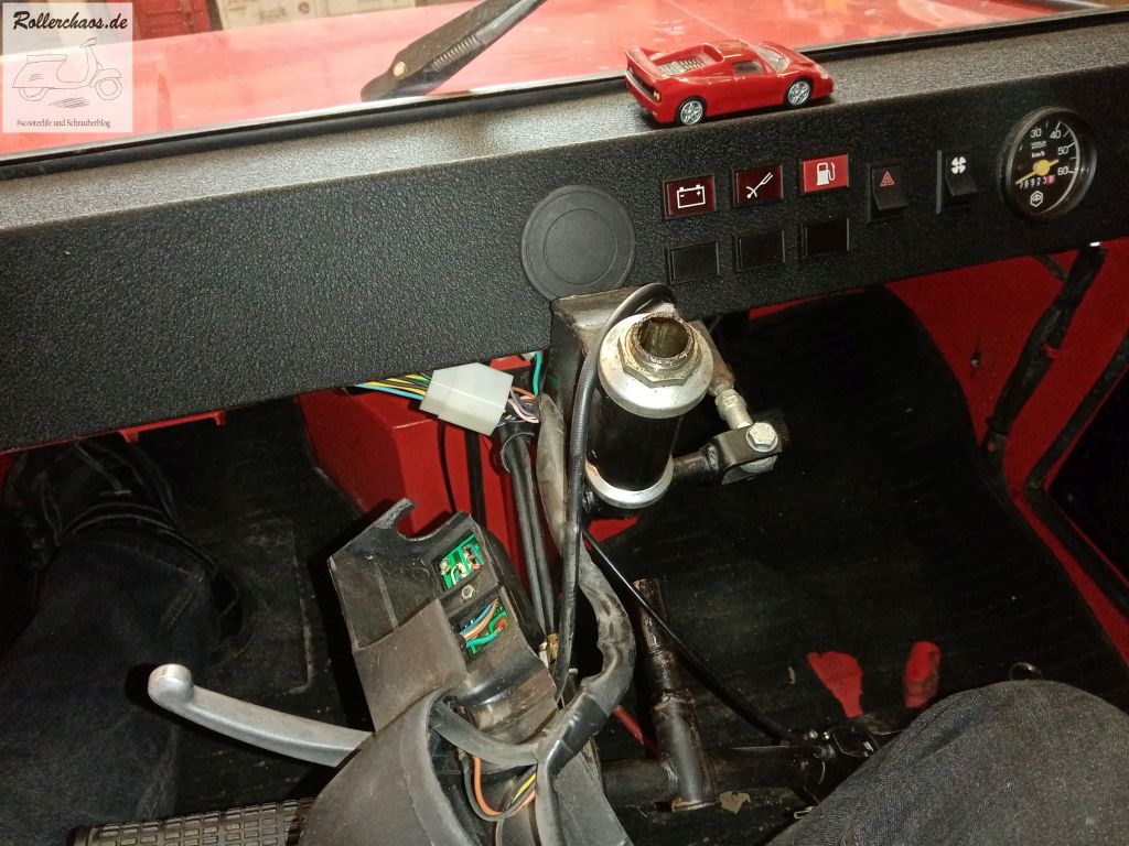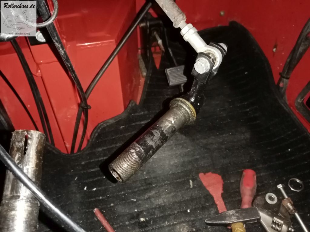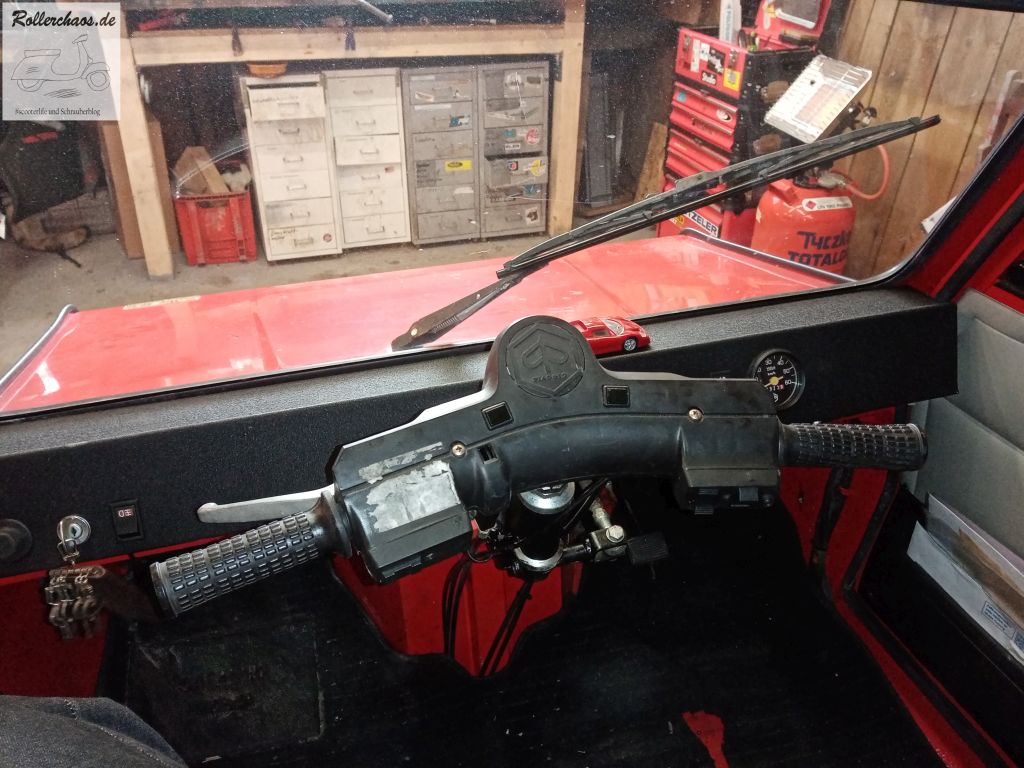 Während die Grundierung trocknete habe ich dann im Innenraum des Sulky weiter gemacht. Der Lenker war vom Vorbesitzer ungünstig hoch gesetzt worden, was dazu führte, dass der Kupplungshebel bei vollem Einschlag die Windschutzscheibe berührte.