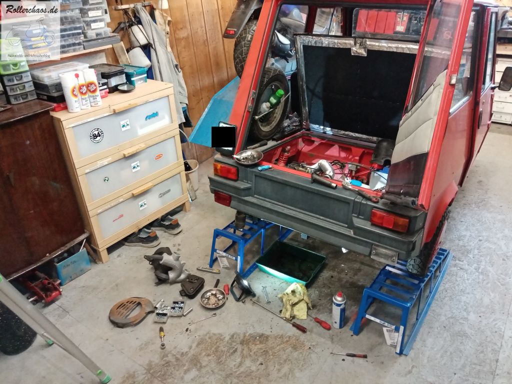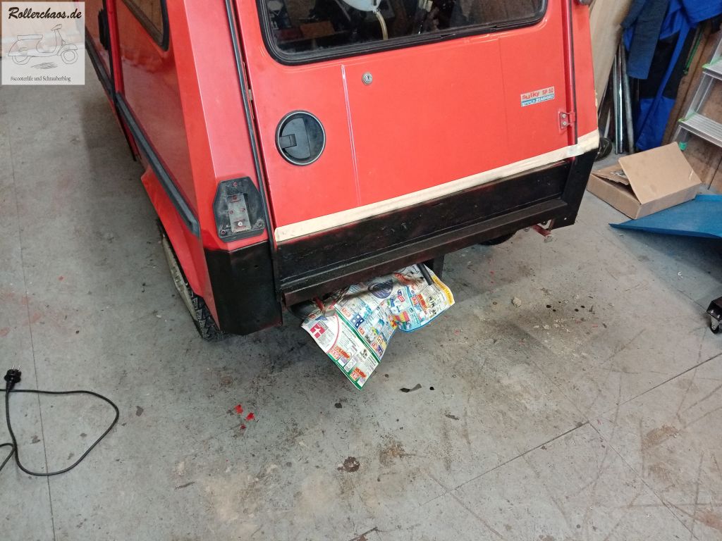 Zuletzt hatte ich die Heckstoßstange wieder angebaut und den Tank, mit neuen Leitungen und einem neuen Füllschlauch versehen, wieder eingebaut. Dummerweise ist dabei eines jener Dinge passiert, die bei alten Autos eben bisweilen passieren.