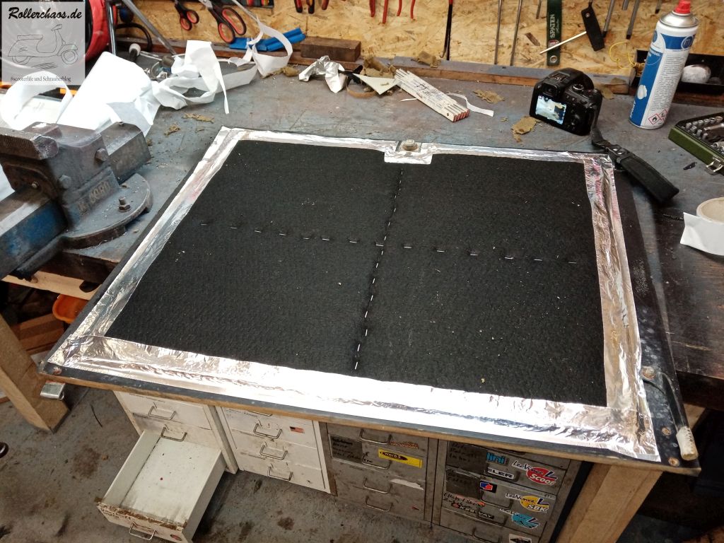 Darüber kam dann eine selbstklebende (und zusätzlich angeklammerte) Motorhaubendämmmatte aus dem Autozubehör. Deren Ränder habe ich zudem mit Aluklebeband gegen eindringendes Wasser, Viecher und Ausfransen geschützt.