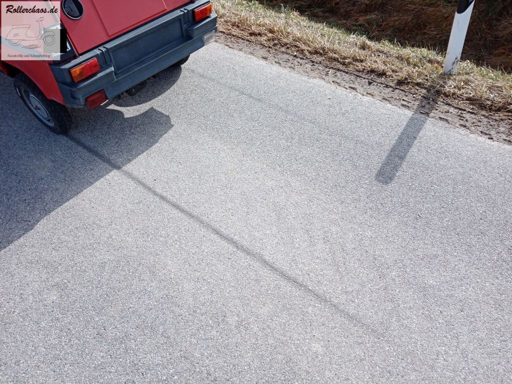 Ein kurzes Stück des Weges ist asphaltiert, hier lässt sich die Bremswirkung und prüfen. Auf dem Foto sieht es nicht so aus, aber die Handbremse malt zwei schön deutliche und gleich lange Striche auf den Boden. So soll das sein.