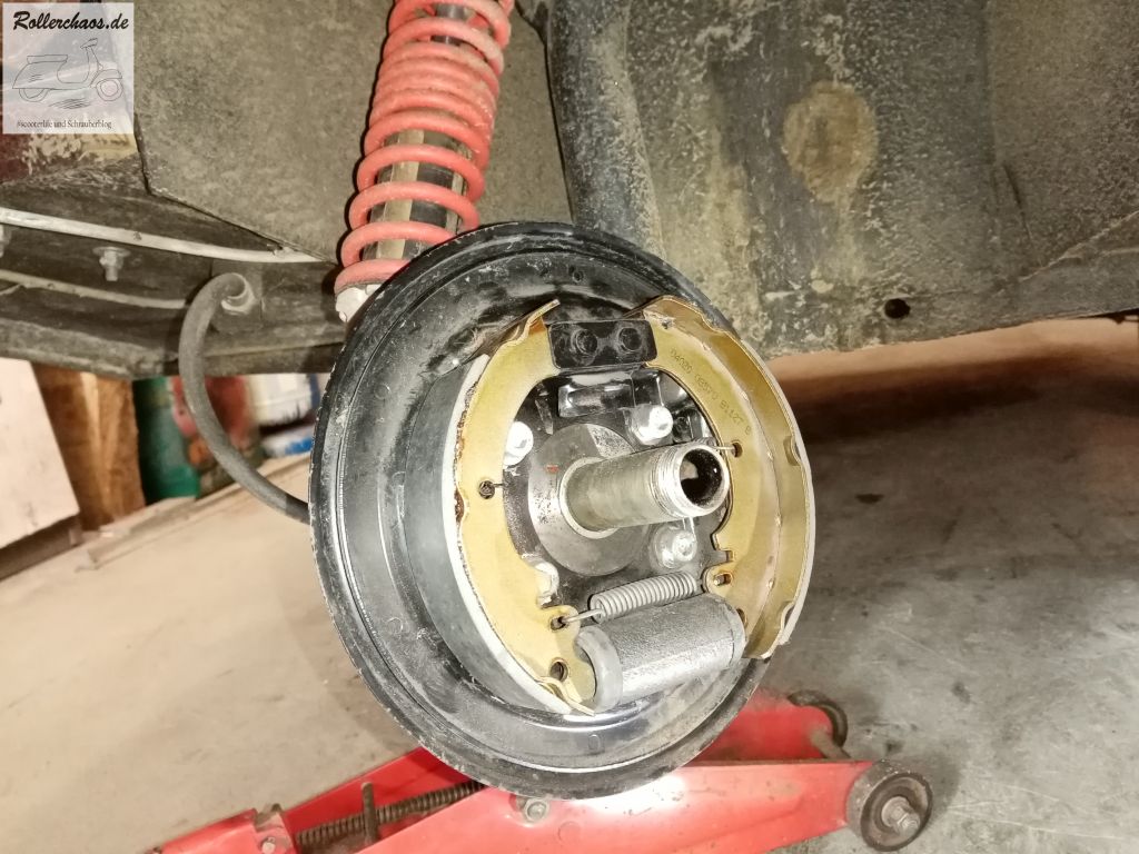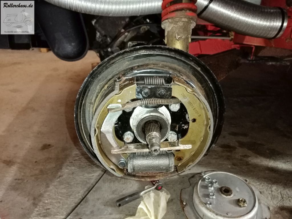Am rechten Hinterrad hatte ich das Zeug schon vor einiger Zeit auseinander gebaut. Einfach weil niemand sicher wusste, was da genau drin steckt. Tatsächlich handelt es sich aber an der Hinterachse um eine ganz normale Ape 50 Bremse. Entsprechend schnell und einfach war hier alles erneuert.