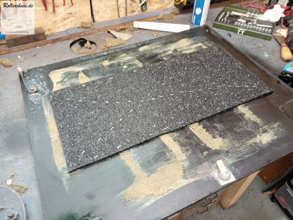 Etwas schwarze Farbe und ein Stück von einer alten Autofußmatte lassen das Teil gleich sehr viel stimmiger erscheinen.