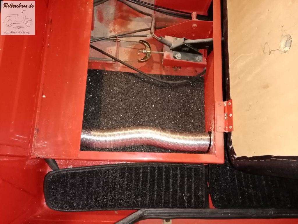 Die Lösung dafür war ein Verschnittstück der Heizungsschläuche aus dem Motorraum. Es passt genau an die Luftführung unter der Sitzbank. Eine saubere Lösung die für ordentliche Heizleistung sorgt.