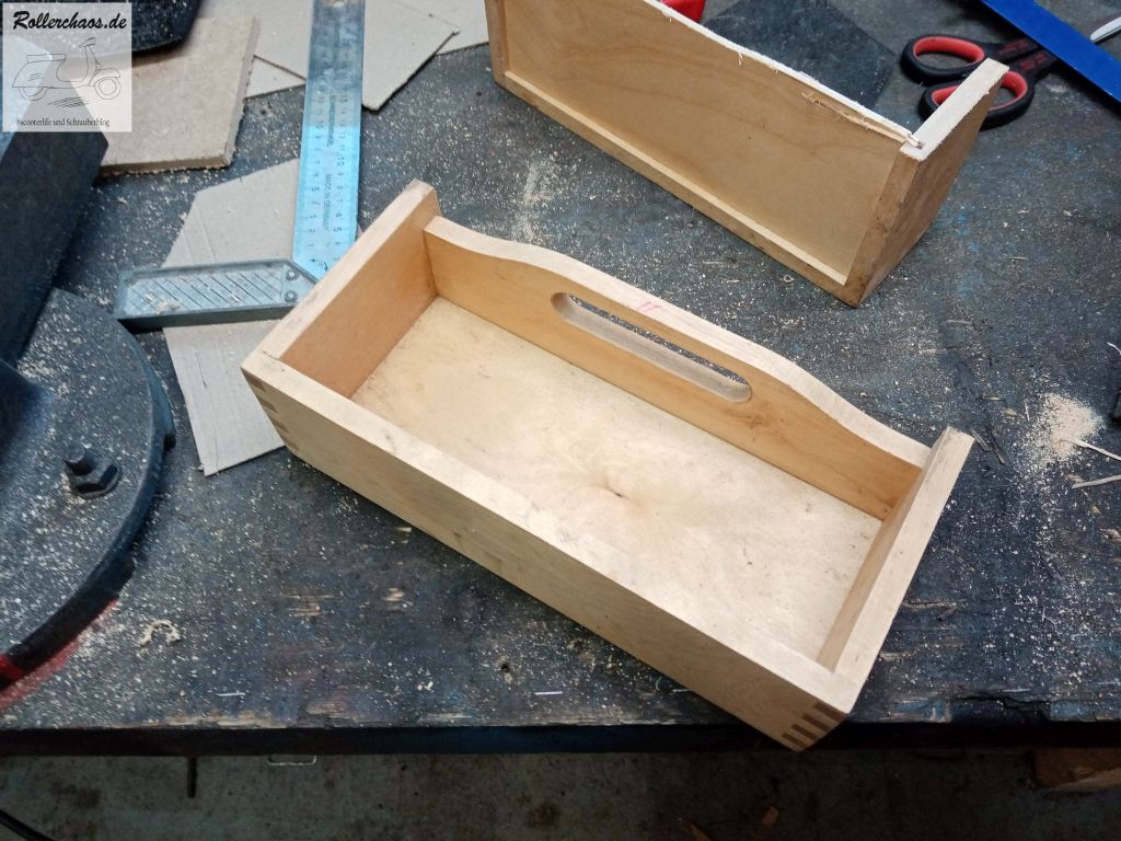 Ein alter Besteckkasten, der aus unerfindlichen Gründen seit Jahren in der Werkstatt rumliegt, musste zuletzt auch noch dran glauben. Denn Platz ist wertvoll im Sulky und so sollte der Raum auf der Verkleidung nicht ungenutzt bleiben.