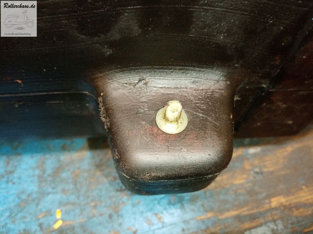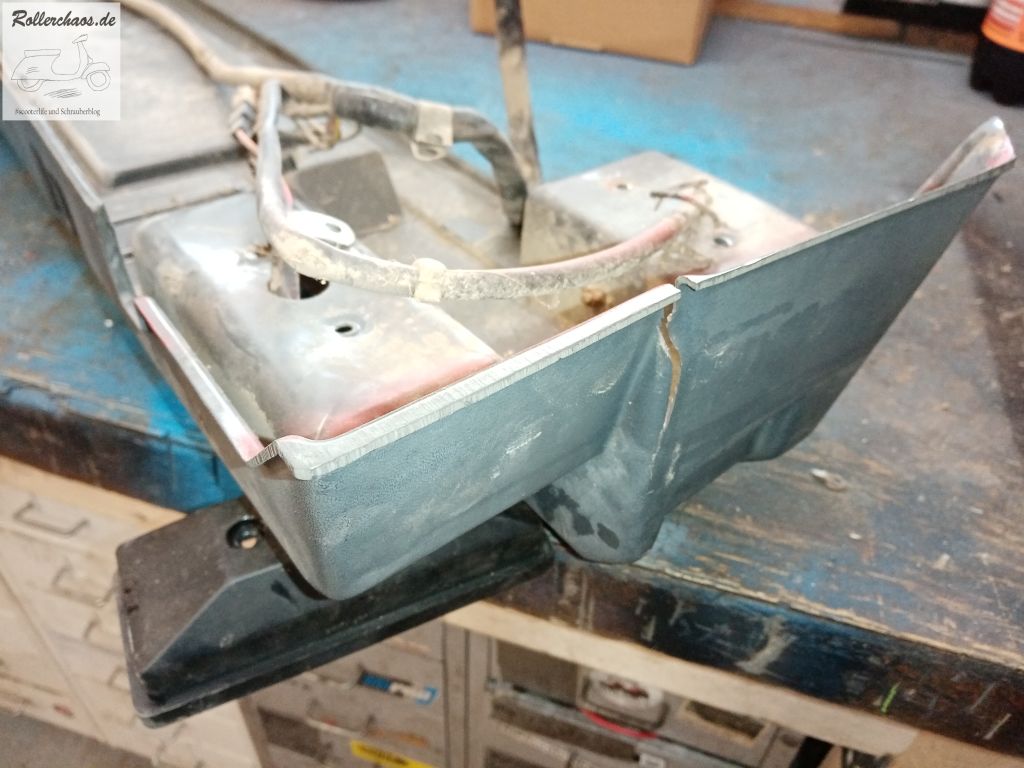Da ich schon dabei war, wollte ich natürlich das komplette Kraftstoffsystem des kleinen Italieners überarbeiten. Dazu zählt auch eine weitere Besonderheit, der elektromagnetische Benzinhahn. Dieser war bei Thums Sulky überbrückt und nicht an die Fahrzeugelektrik angeschlossen. Es lag also der Verdacht nahe, dass das Teil defekt sei. Zur Prüfung baut man es sinnvollerweise aus, was leider die Demontage der kompletten Heckverkleidung erfordert.