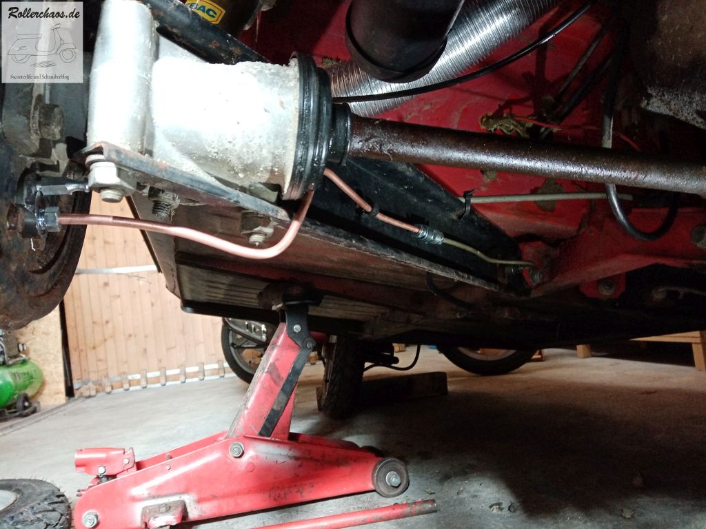 Hinten links gab es dann aber doch Schwierigkeiten. Denn anders als auf der rechten Seite war hier alles ziemlich zusammengerostet. Radbremszylinder und Bremsleitung waren derart fest, dass ich sie am Fahrzeug nicht trennen konnte.