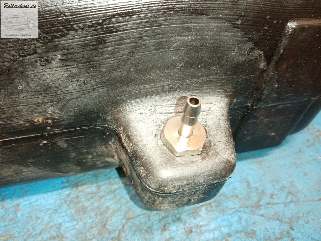 Nachdem der Tank eingebaut war und ein Probelauf des Motors problemlos funktioniert hat, brach plötzlich der Schlauchanschluss für den Benzinschlauch ab. Vermutlich hat der ausgehärtete Kunststoff beim Einbau einen Schlag gekriegt und die Vibrationen beim Probelauf haben ihm dann den Rest gegeben. Sehr ärgerlich, aber es passiert eben.