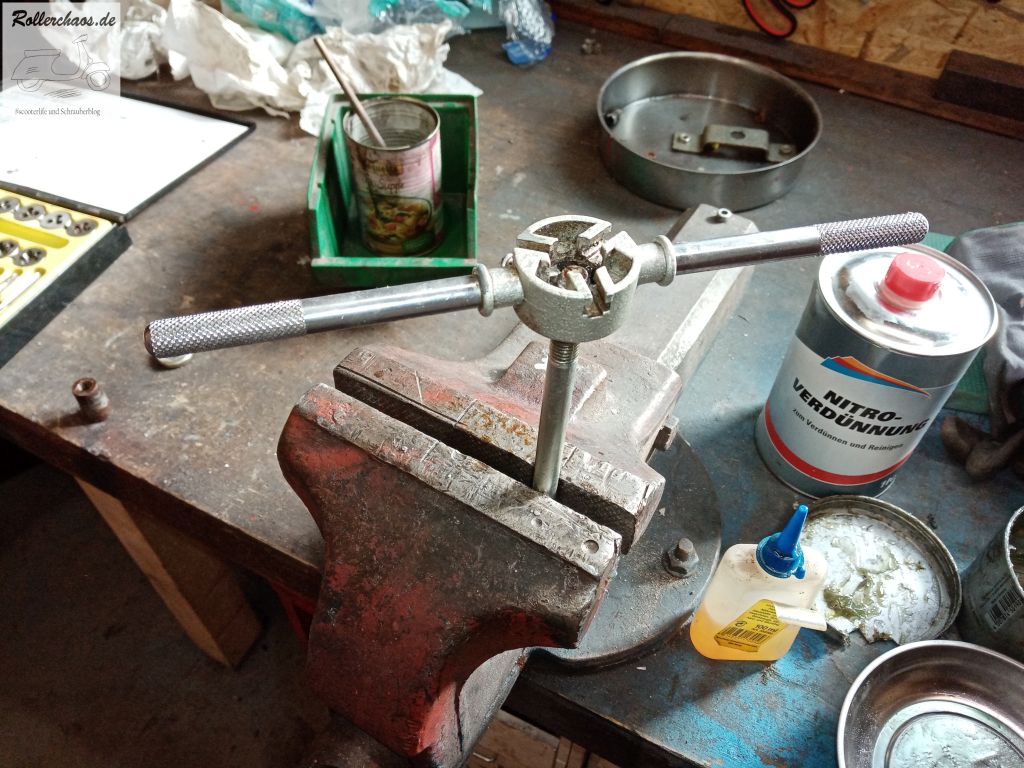 Die Gewinde im Klemmkloben und in der Lenkerschraube waren völlig überdehnt und mussten nachgeschnitten werden. Wie das halt so ist, wenn Gewaltmenschen ohne Sinn und Verstand an einem Fahrzeug schrauben.