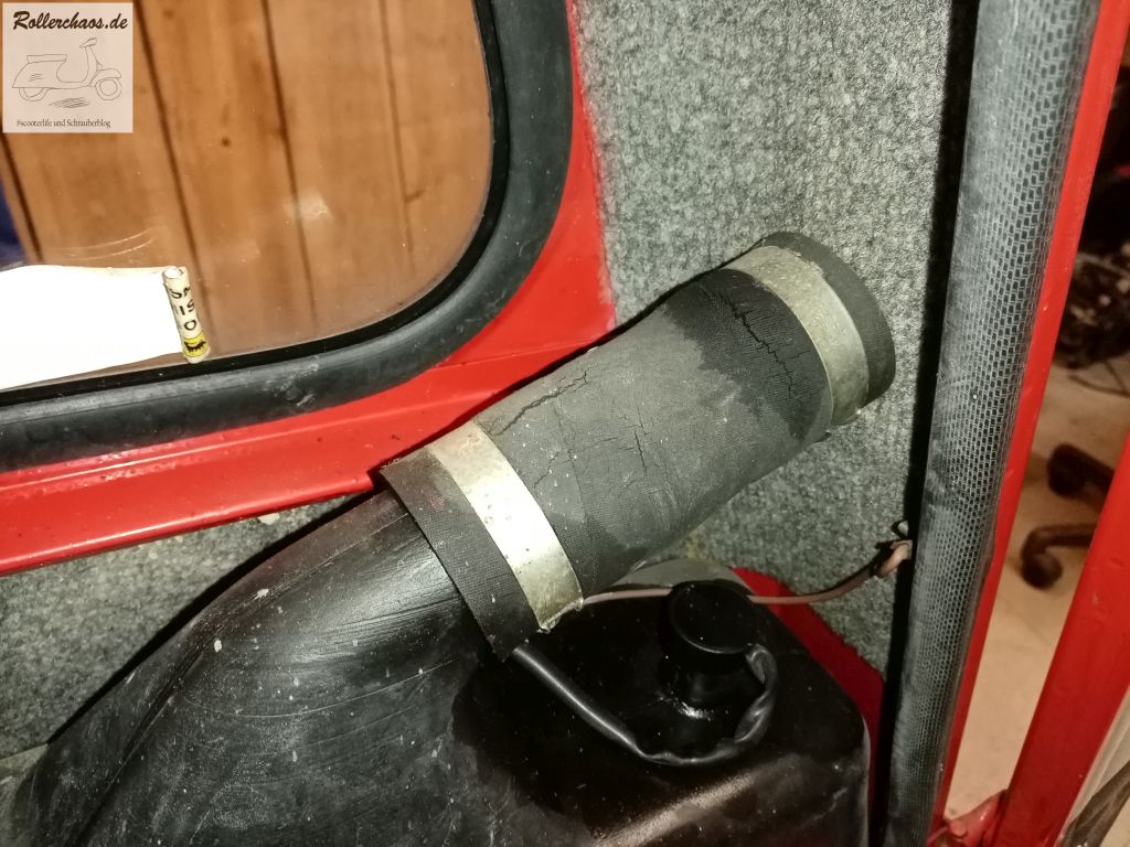 Danach ging es darum den penetranten Benzingeruch im Innenraum zu beseitigen. Eine der Ursache dafür war der völlig versprödete Gummischlauch zum Tankstutzen.