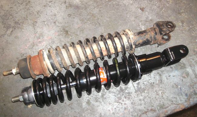 Schau dir mal mein Vergleichsfoto der hinteren Federbeine an. Da siehst du, dass die Feder des YSS anders ist als die des Originalteils. Zum einen ist es eine progressive Feder und zum anderen ist der Federdraht dicker, was eine höhere Federrate (sprich: härter) anzeigt.