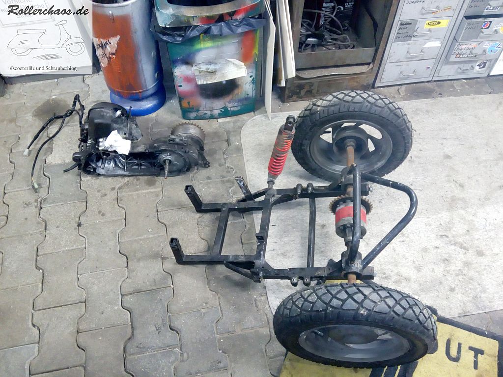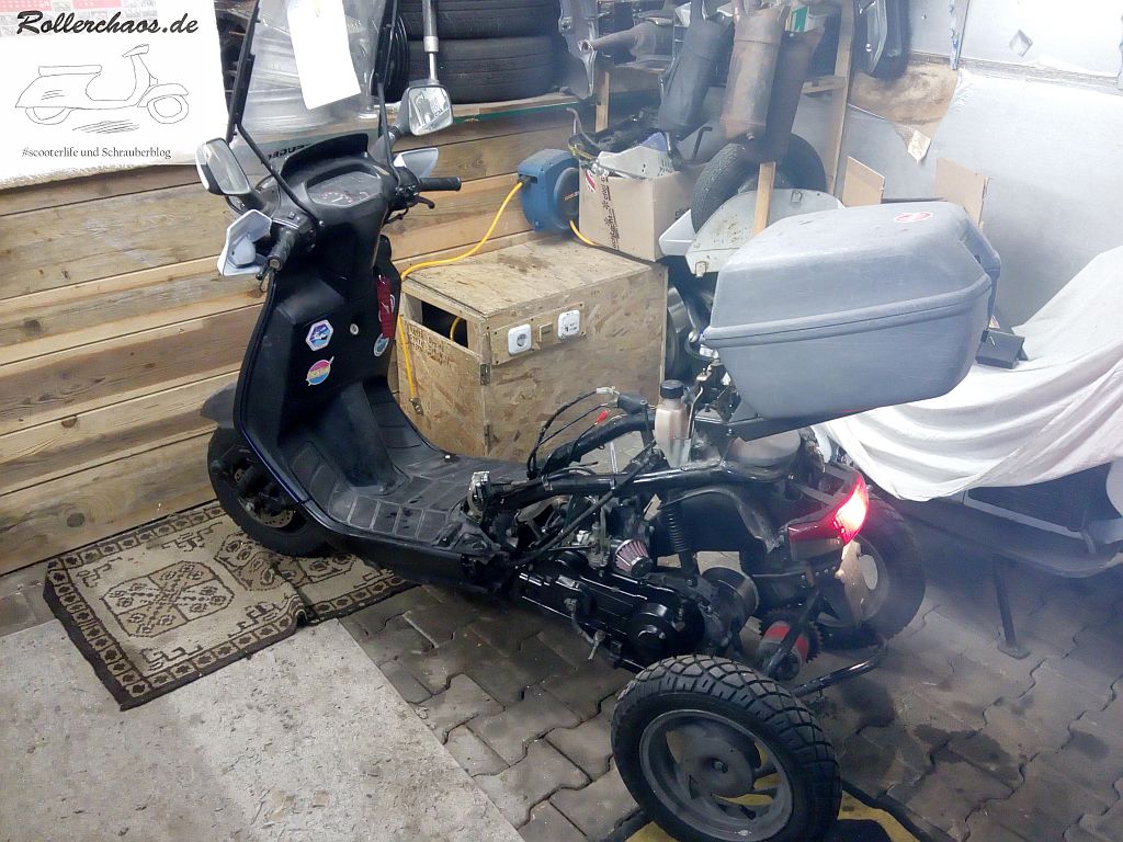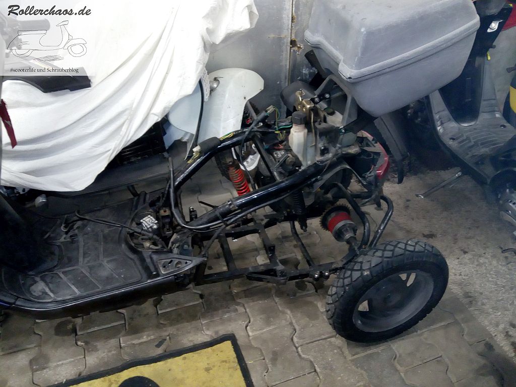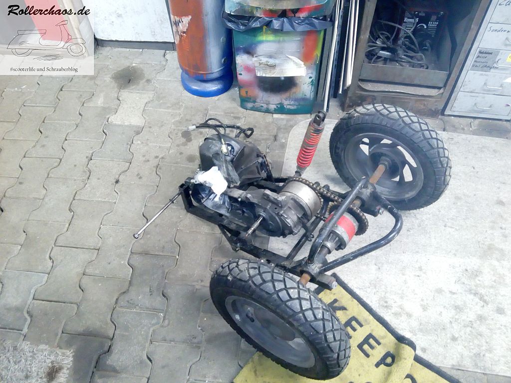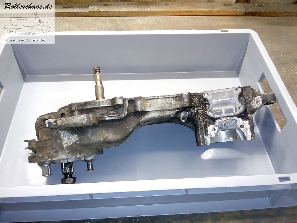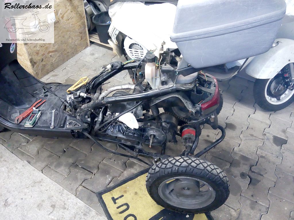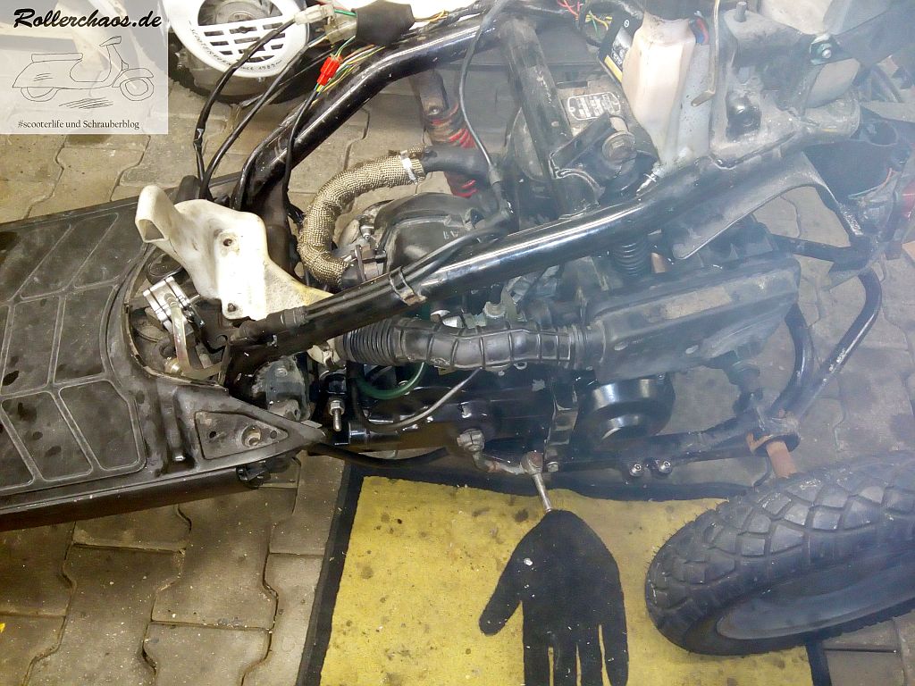 Wenn dann, wie bei diesem Exemplar, durch Werkstattpfusch in der Vergangenheit, sämtliche Schrauben überdehnt und vernudelt sind, dann ist es eine ziemliche Quälerei, bis der Roller vom Fahrschemel getrennt ist.