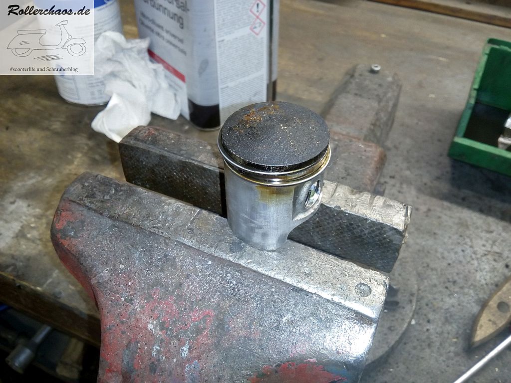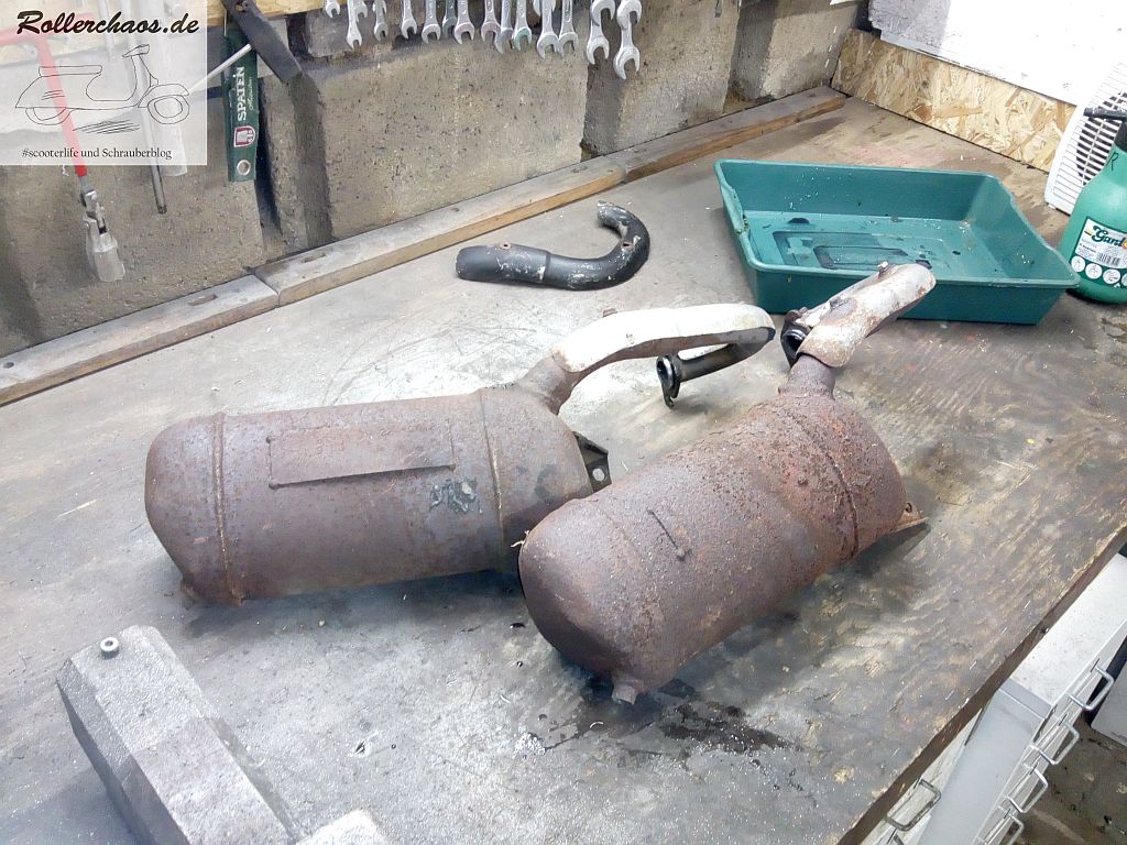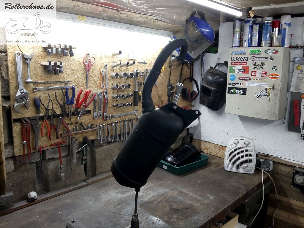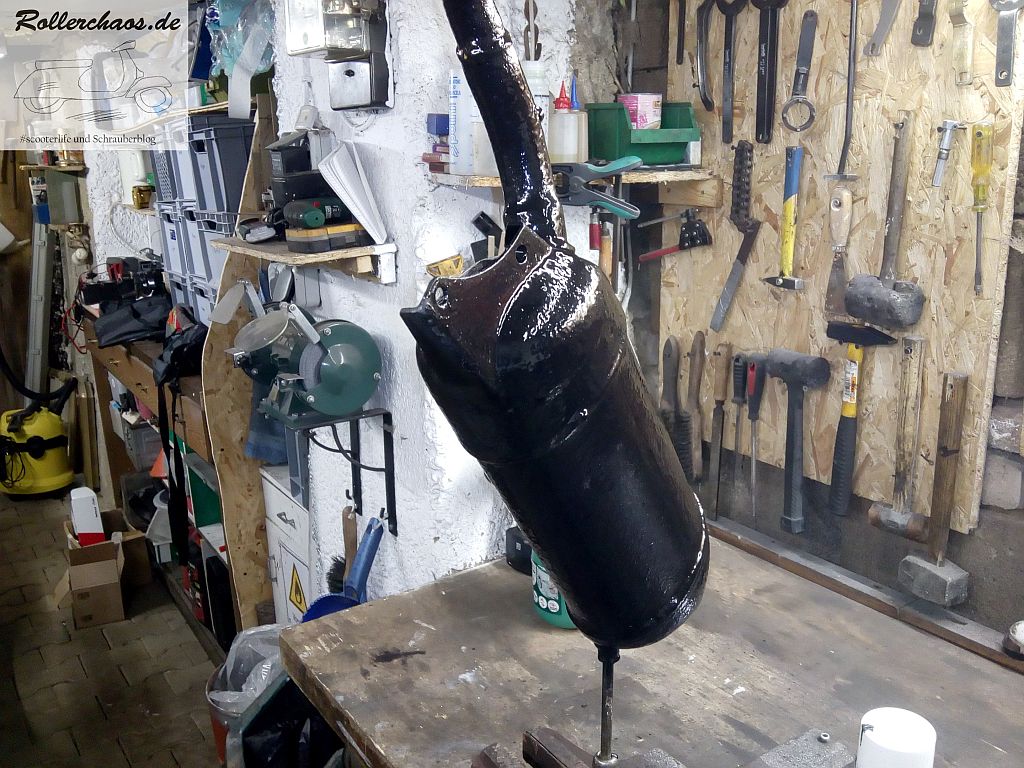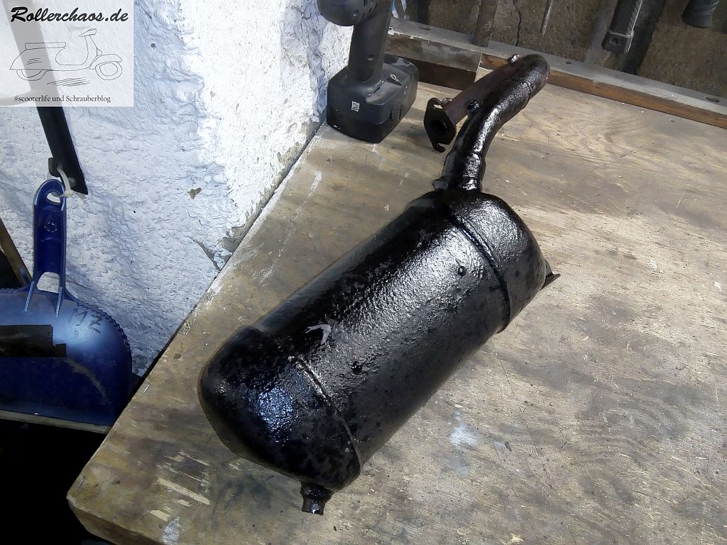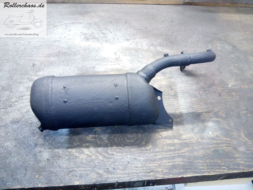 Der beim letzten mal eingelegte Auspuff bekam dann noch eine Dusche mit frischer Farbe. Somit sollte er beim nächsten Werkstatttag bereit für den Einbau in den Roller sein. Wann auch immer das sein mag.