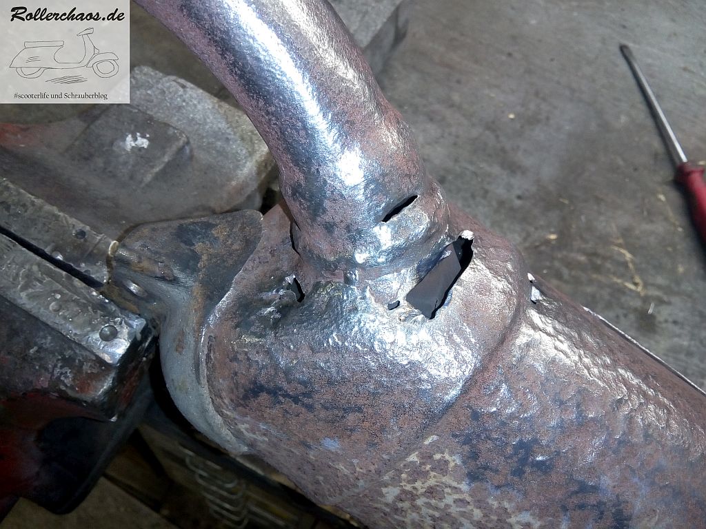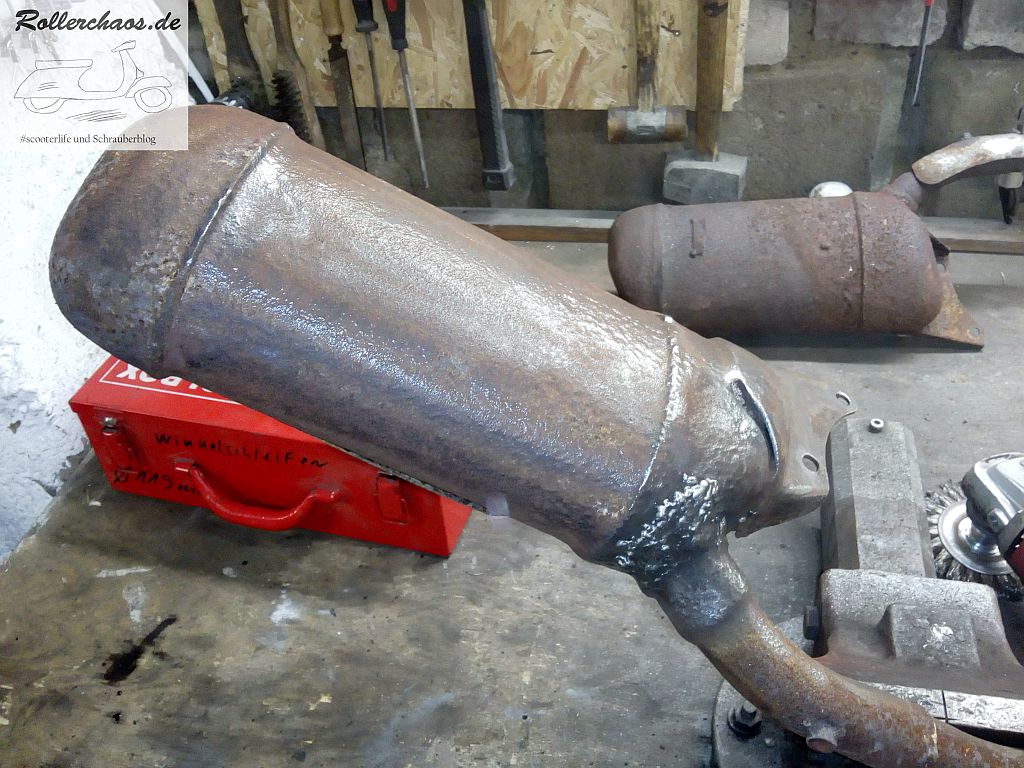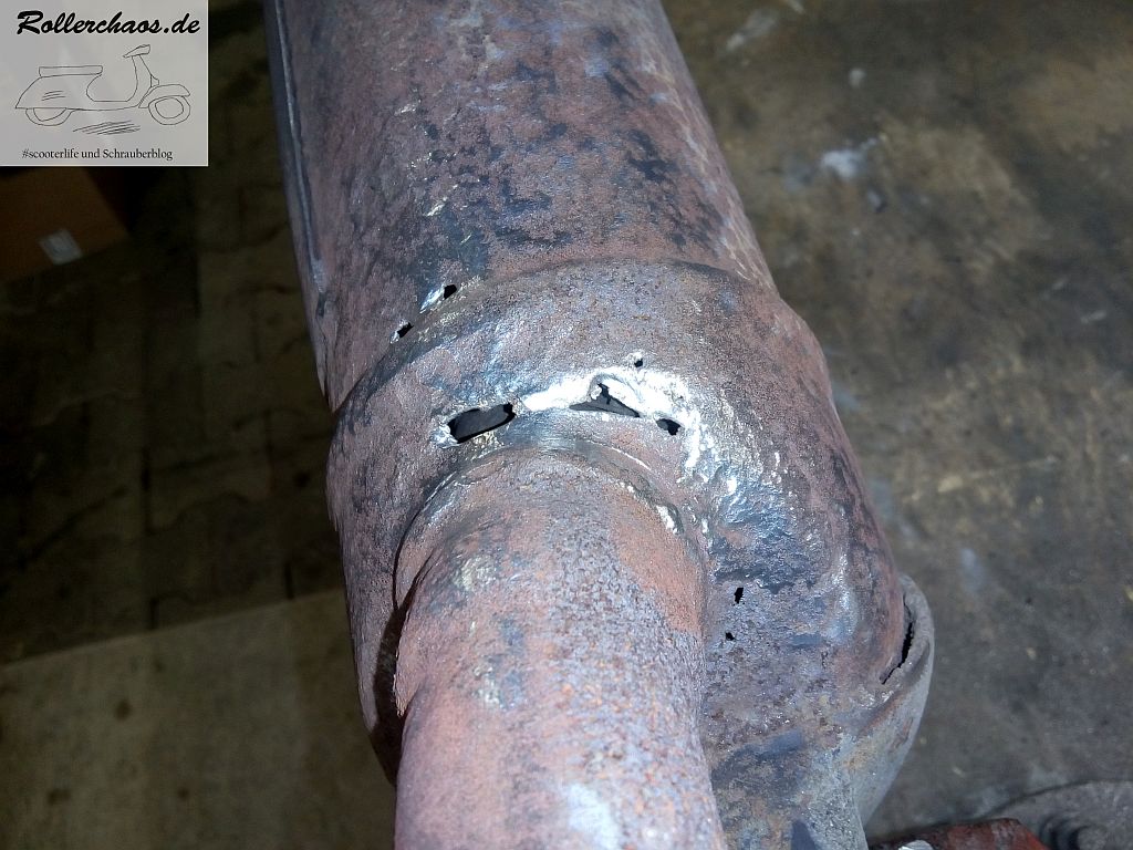 Der bessere der beiden ist leider schonmal nachgeschweißt worden. Nicht schön, aber es sollte halten. Da man beim R7 den Auspuff nicht sieht, ist die Optik sowieso zweitrangig.