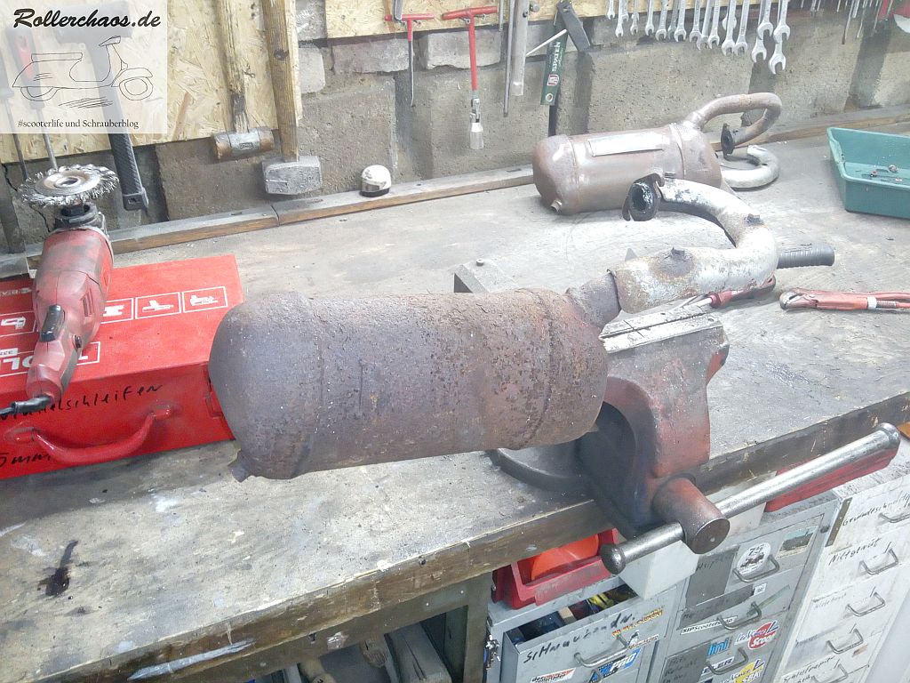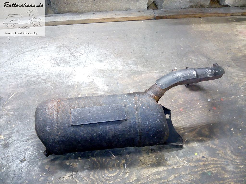 Sicher, es war klar, dass der nicht mehr toll ist. Aber mit so tiefem Rostfraß hätte niemand gerechnet. Jetzt beginnt also die Suche nach Ersatz. Originale Auspuffe für SV50 sind rar, aber leider beim R7 die einzige Option, denn passendes Zubehör gibt es hier nicht.